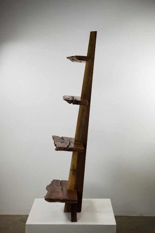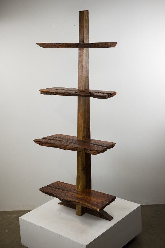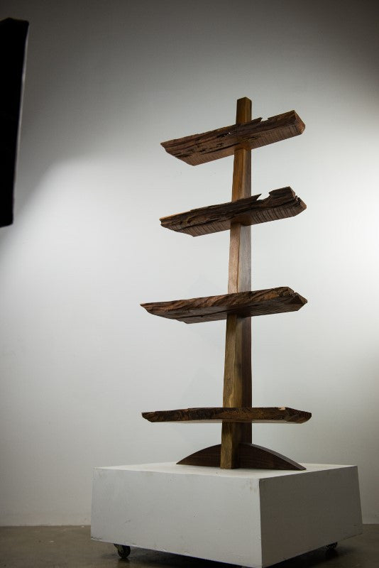 This beautiful shelving unit has a Black Walnut Spine with Black Walnut shelves. It has many carpenter ant trails and cracks throughout giving it unique and stunning characteristics. It stands just under 6 feet tall and the shelves are 26" x 11". It has a hand rubbed finish with 100% organic AFM Safecoats oil and wax. It is smooth and silky to the touch. This piece is designed to stand alone or can be leaned up against a wall.