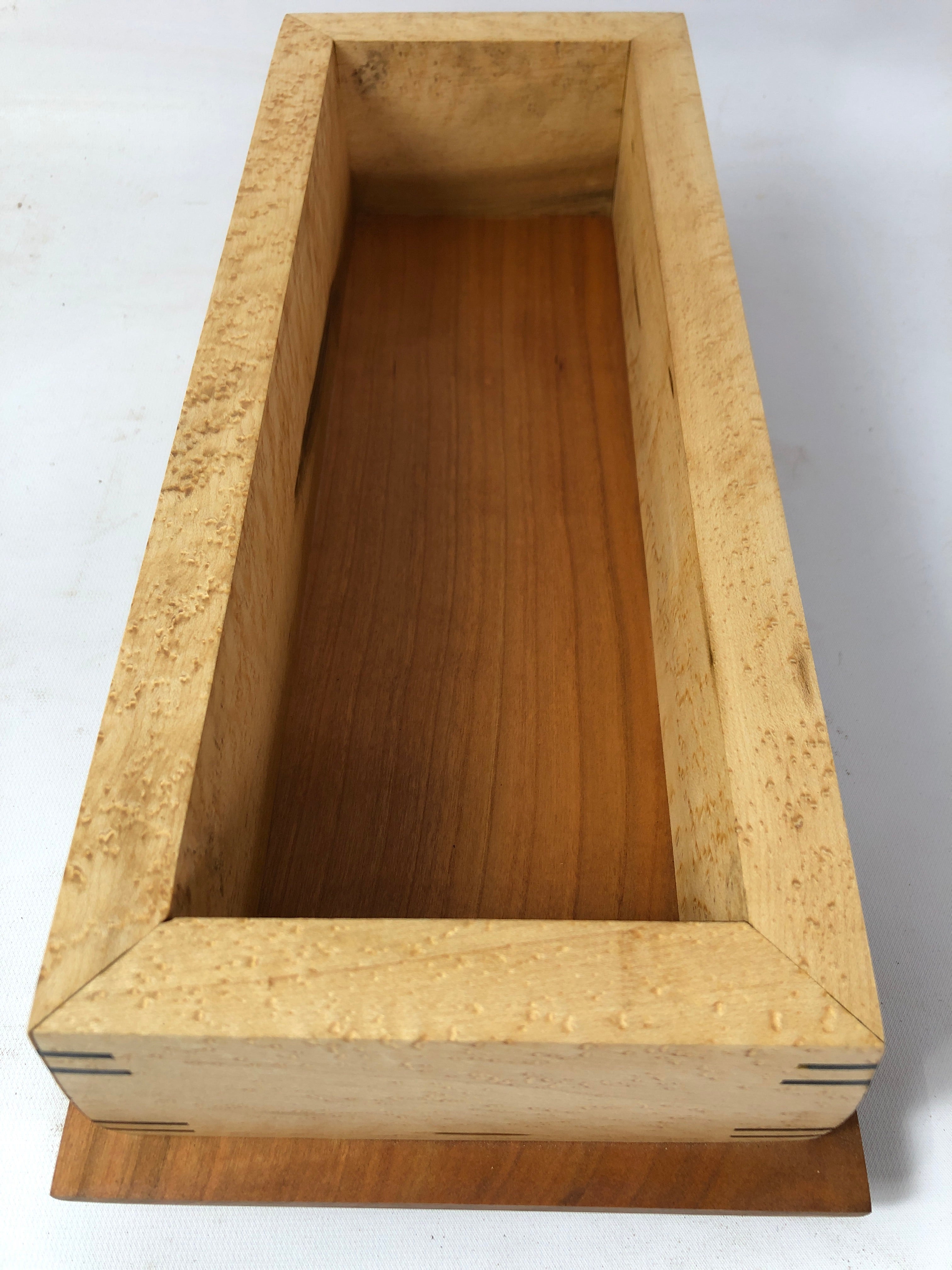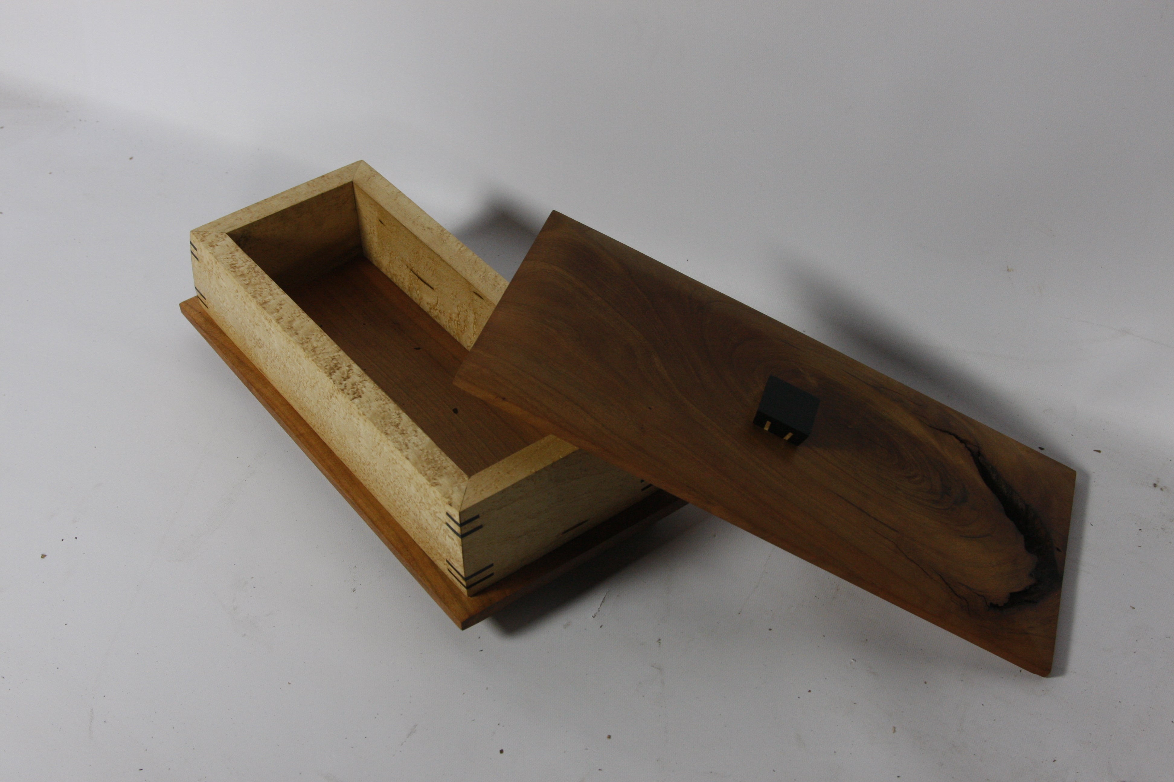 The perfect gift for a friend or yourself! This beautiful hand crafted heirloom memento box is perfect for storing keepsakes. Chosen for their incredible figure, the woods used in creating this one-of-a-kind heirloom piece are Cherry wood, Birds Eye Maple and Macassar Ebony.