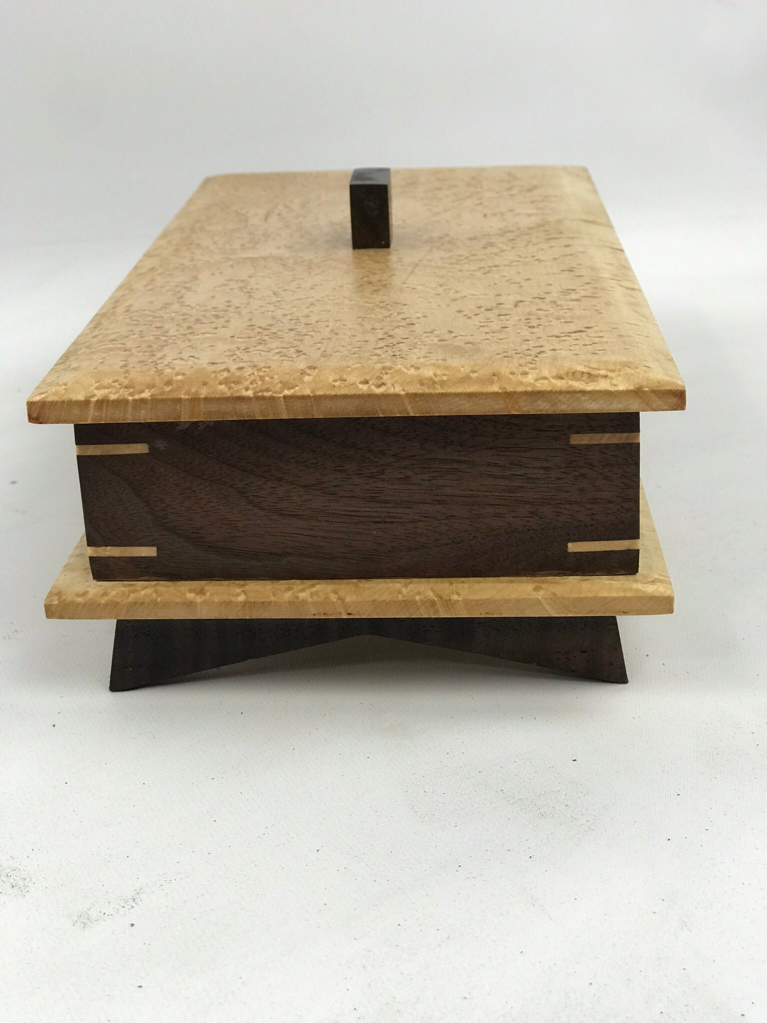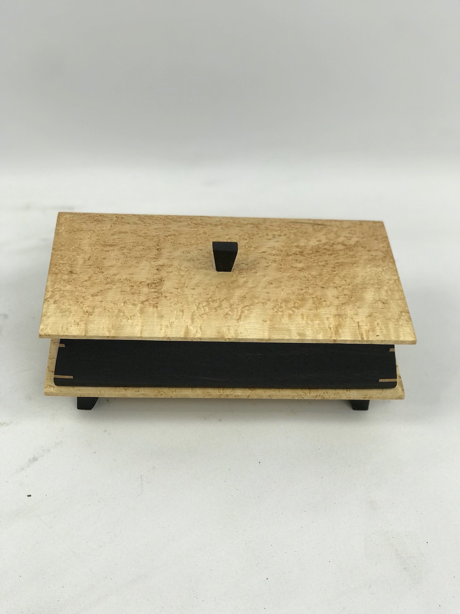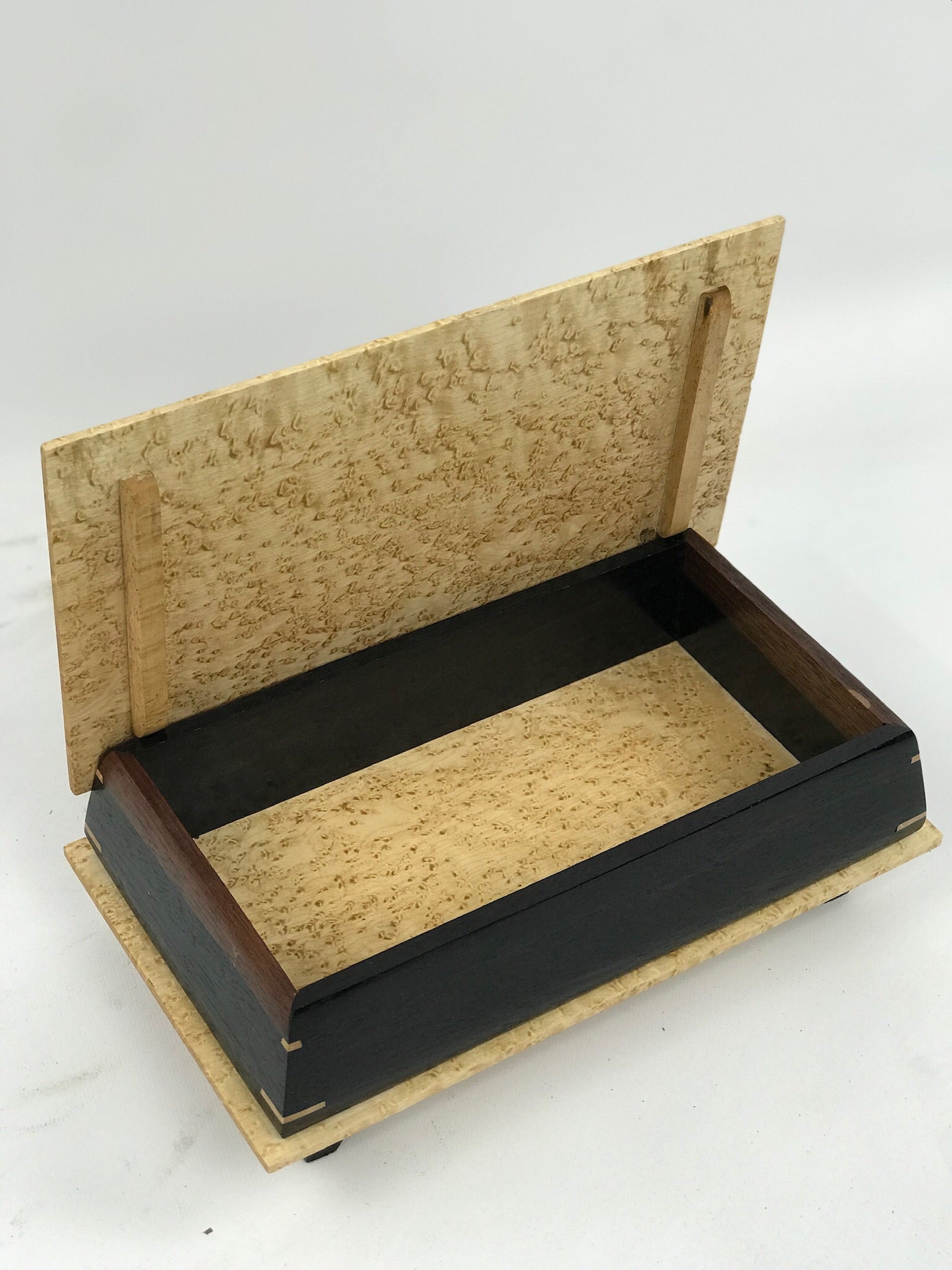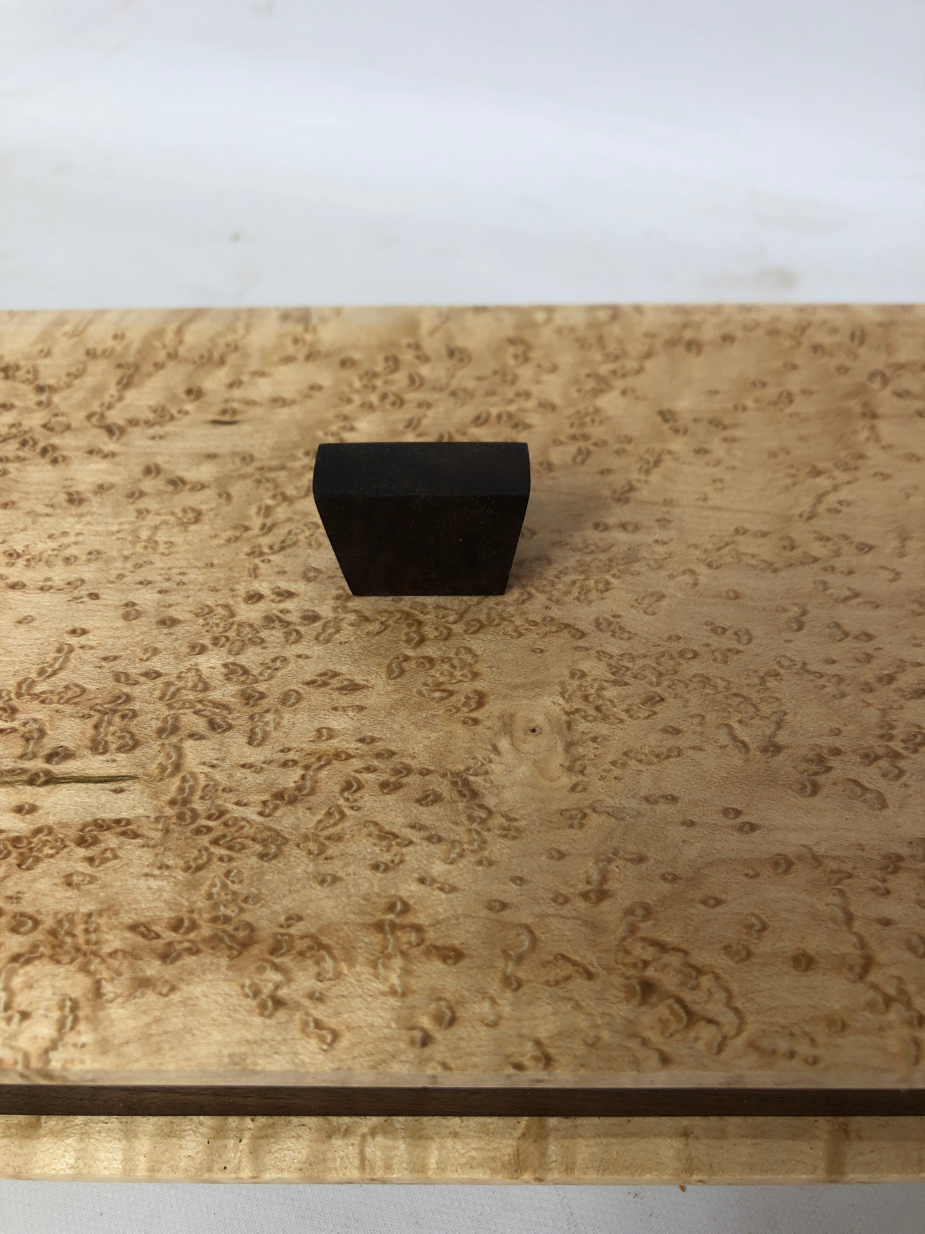 A beautiful way to store your keepsakes, and an even better way to say you care. This incredibly figured live edge artisan memento box has a timeless beauty that will be enjoyed for generations. Macassar Ebony and Birds Eye Maple make this memento box shine!