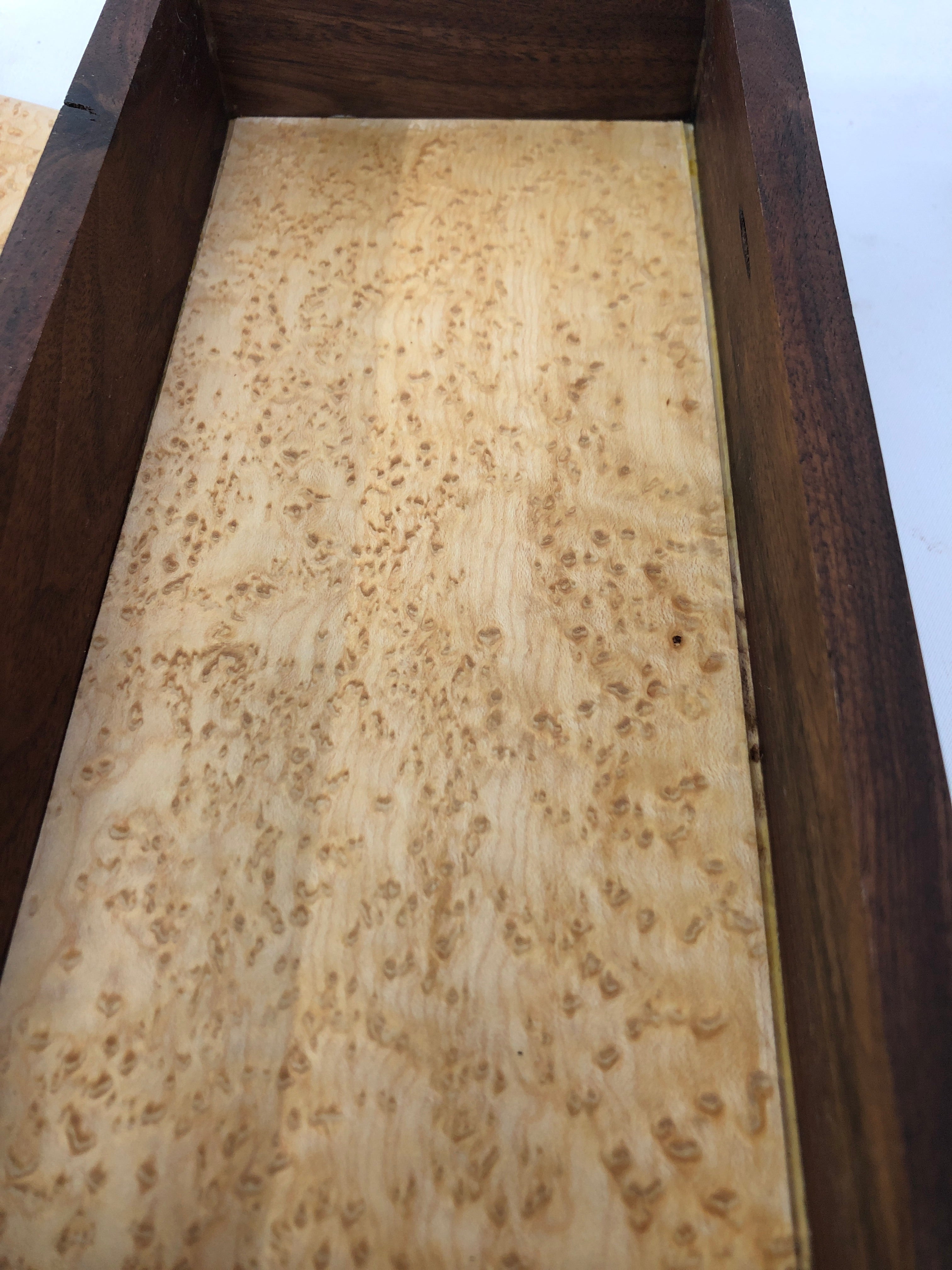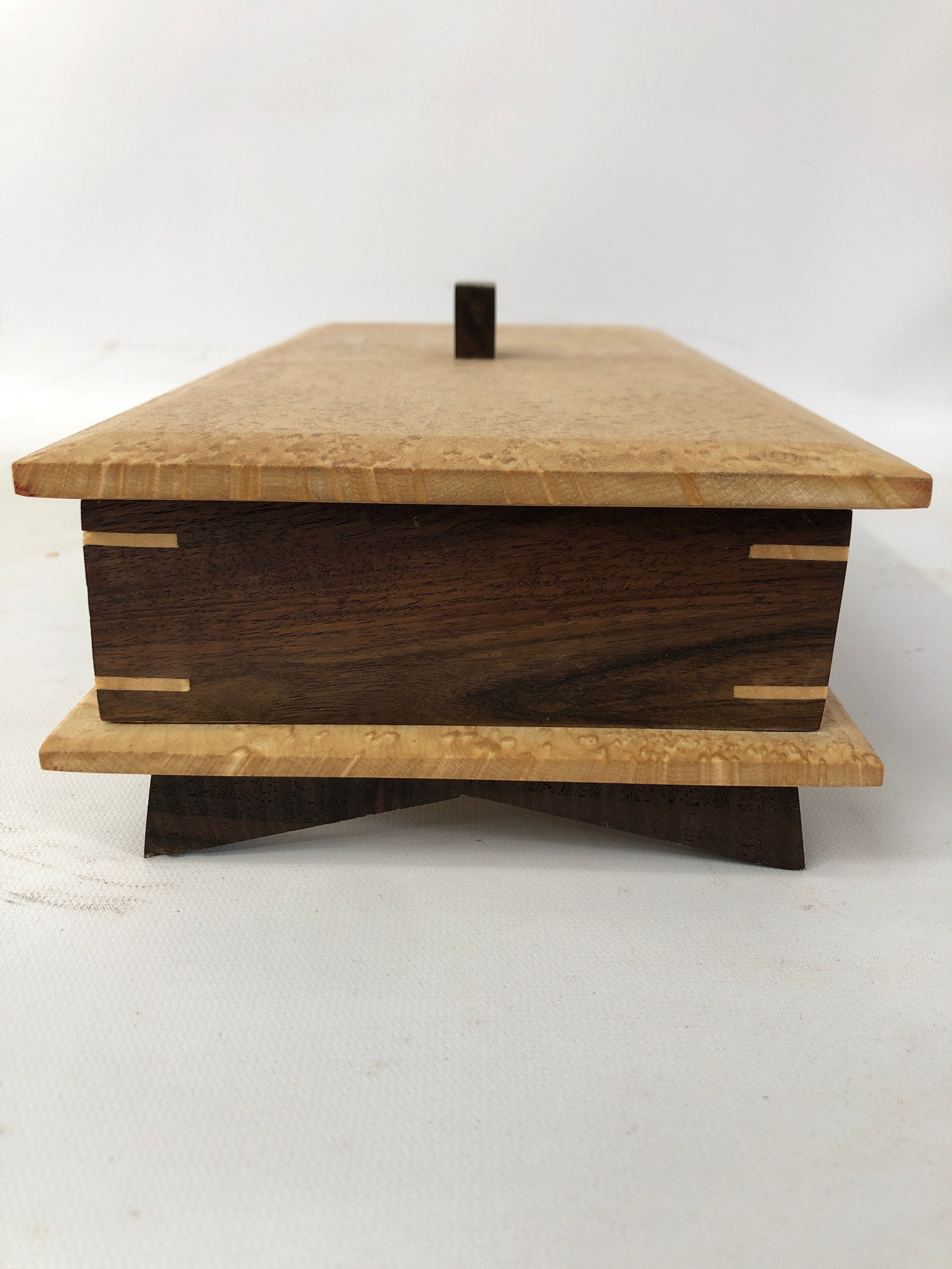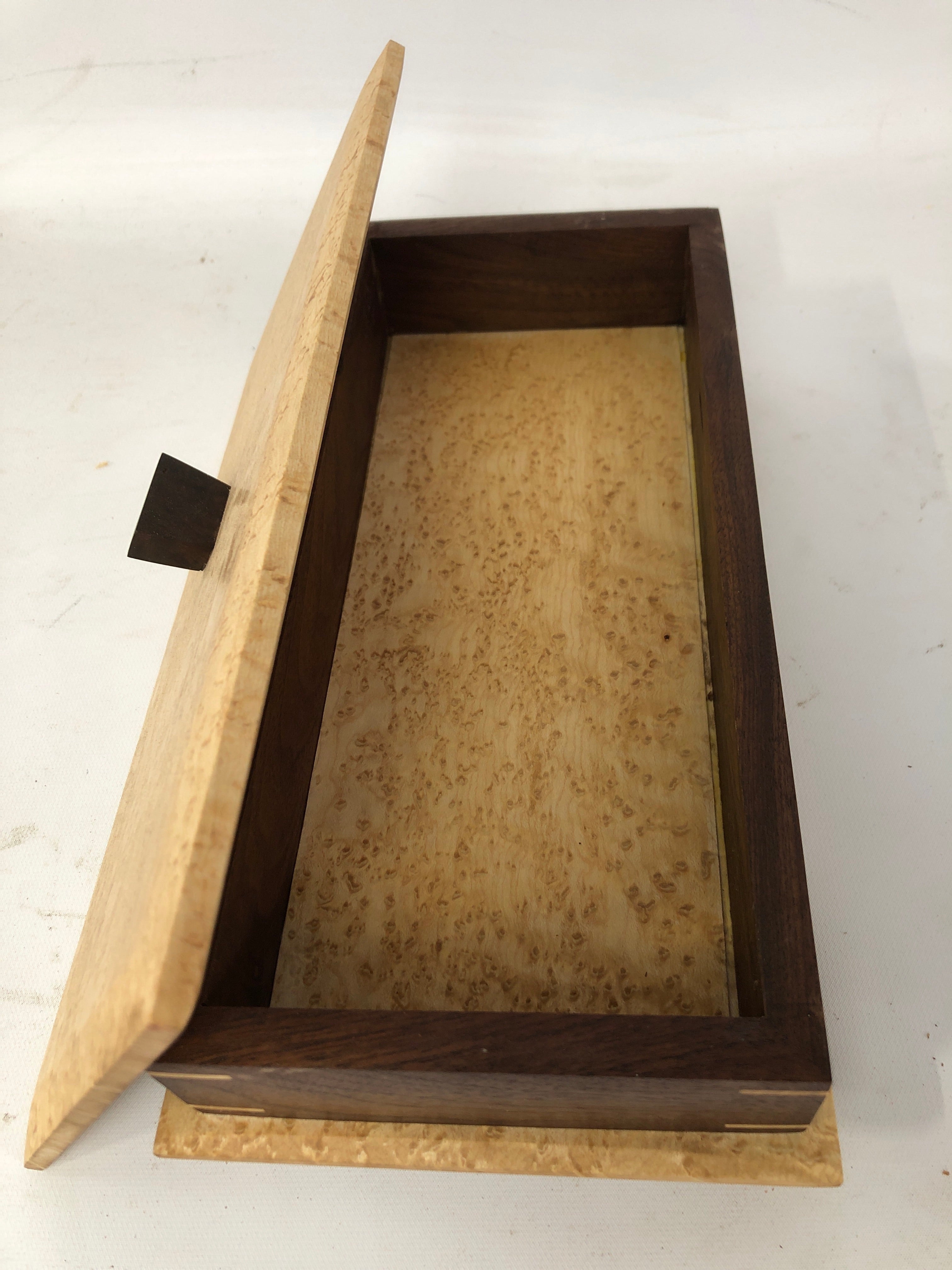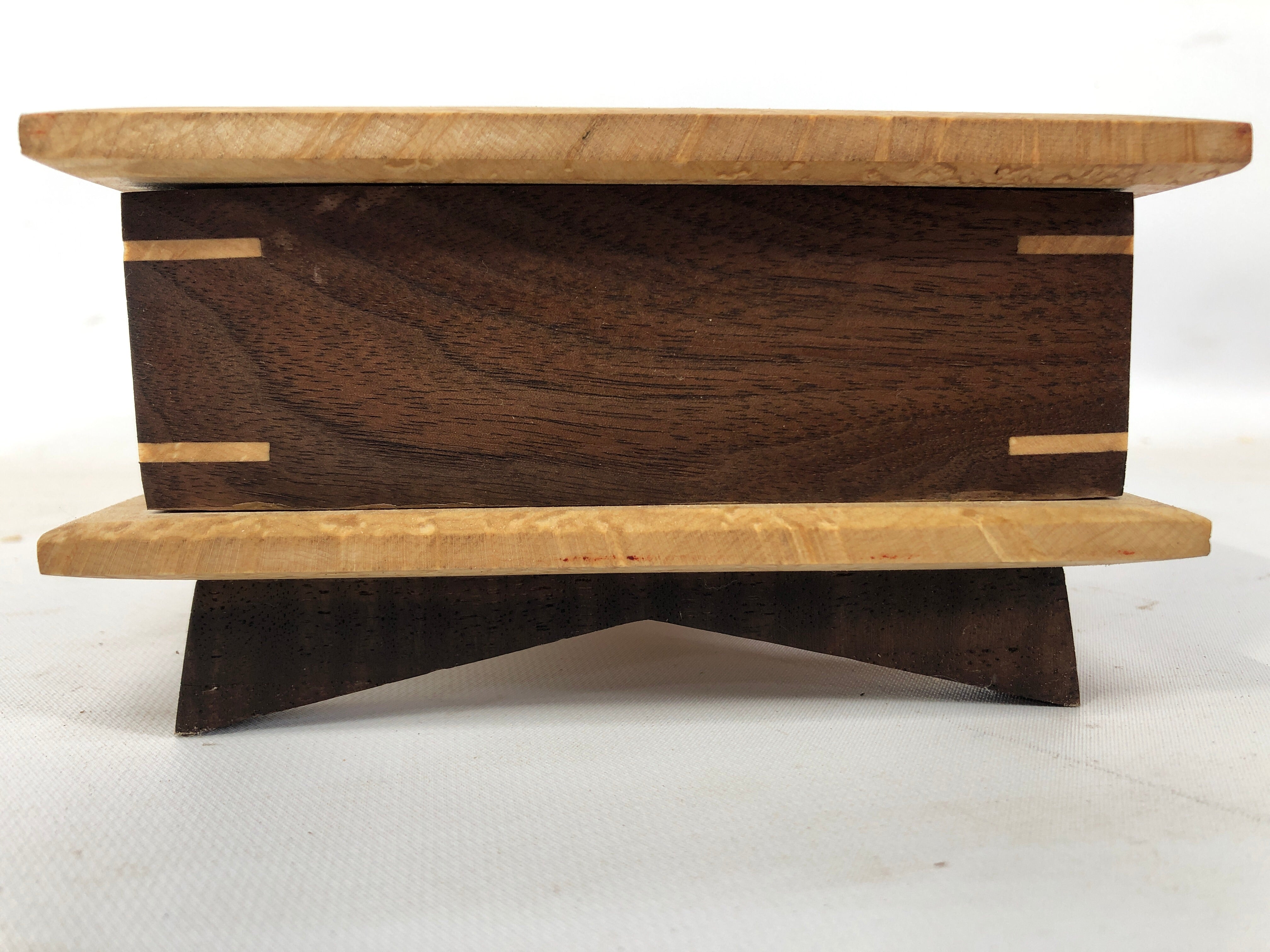 A beautiful way to store your keepsakes, and an even better way to say you care. This incredibly figured live edge artisan memento box has a timeless beauty that will be enjoyed for generations. Macassar Ebony and Birds Eye Maple make this memento box shine!