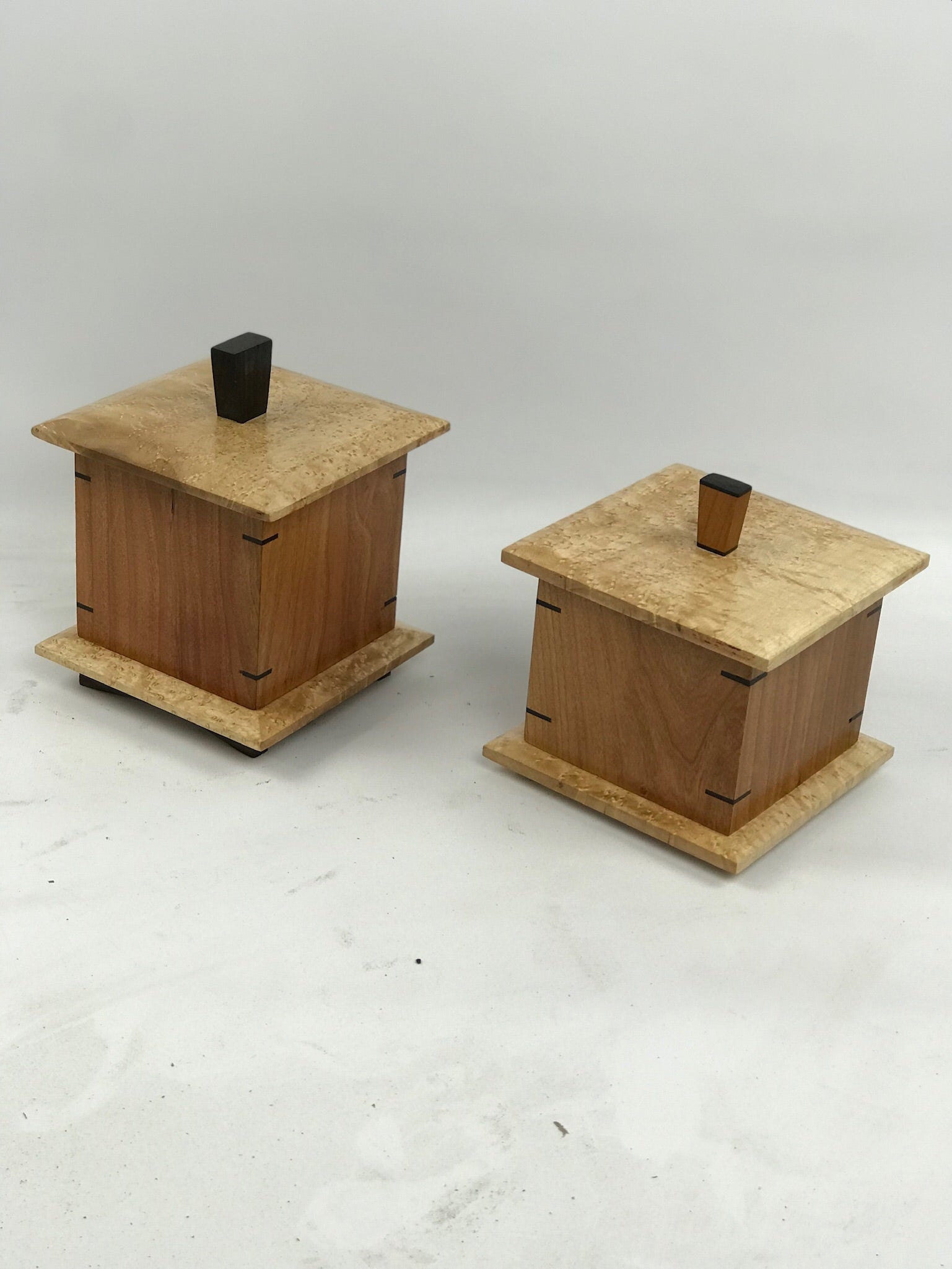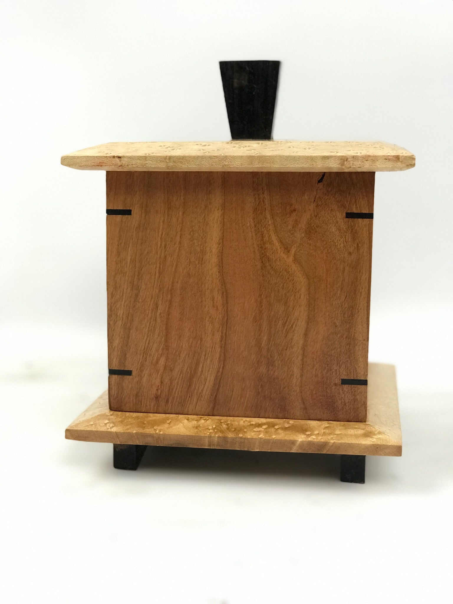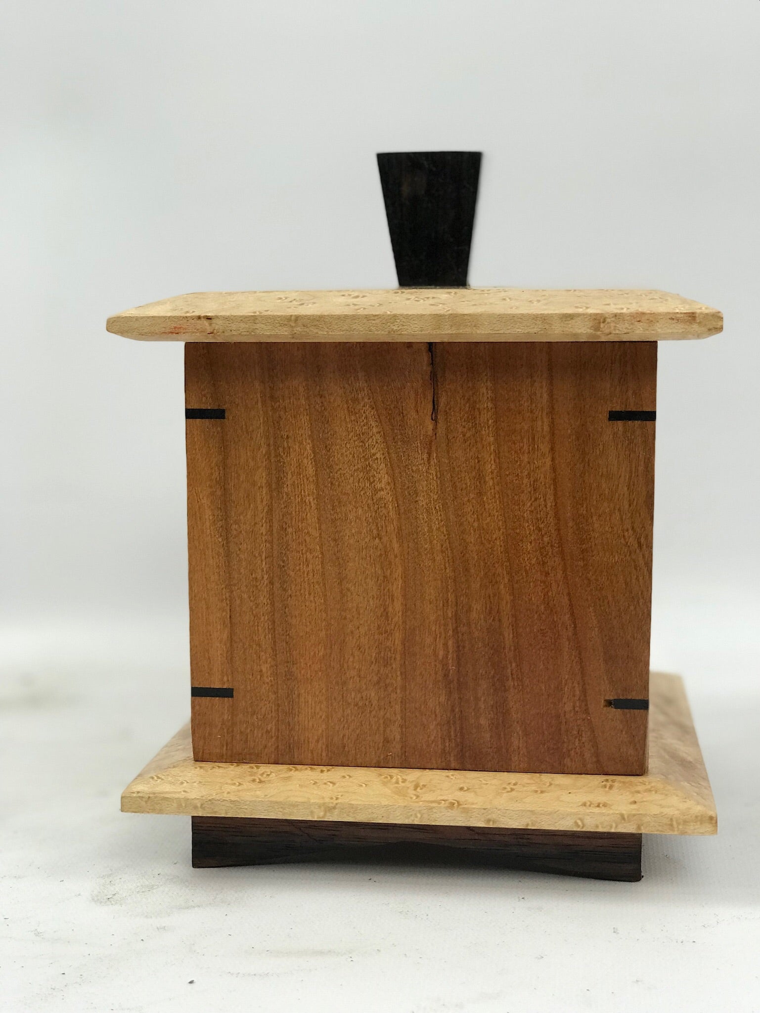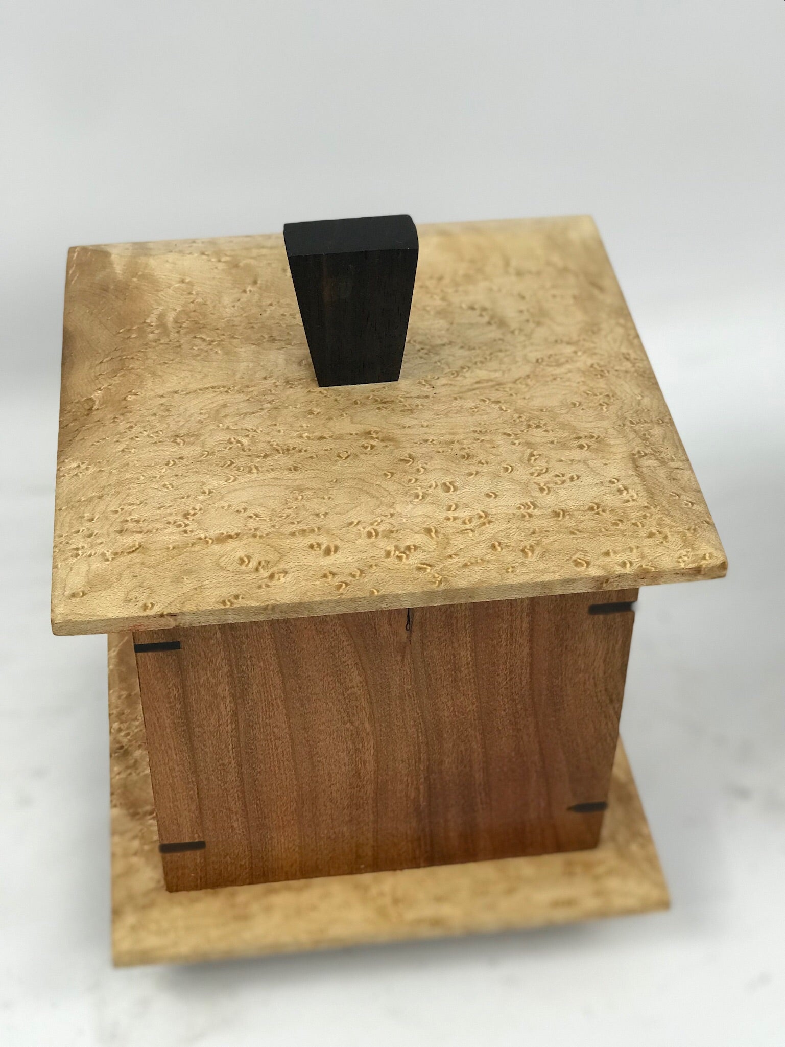 Cherry wood, with highlights of Birds Eye Maple as well as Macassar Ebony adorn these beautiful keepsake memento boxes. Increasingly popular for use as urns, these heirloom pieces will maintain your loving memories while bringing beauty into any environment.