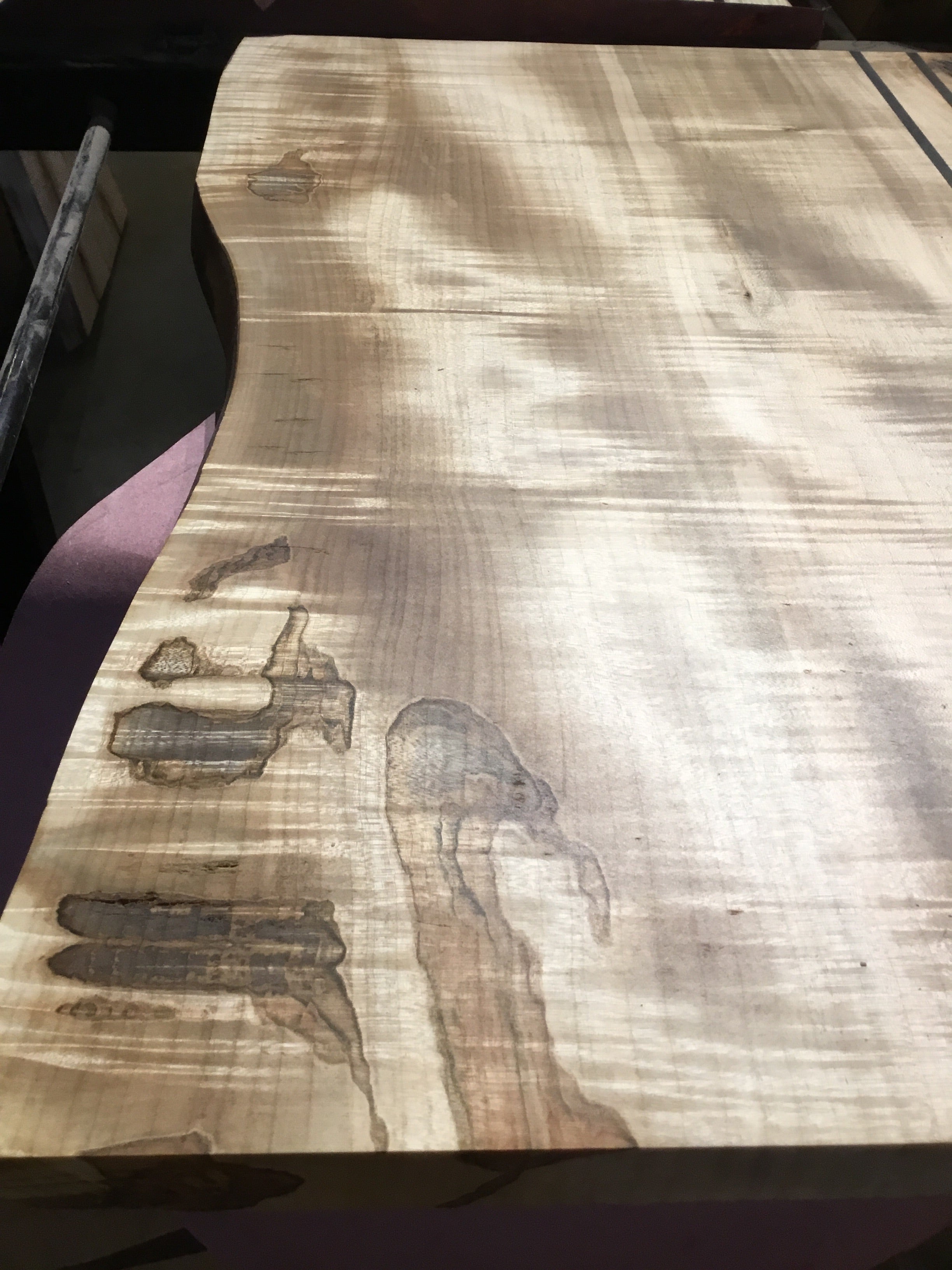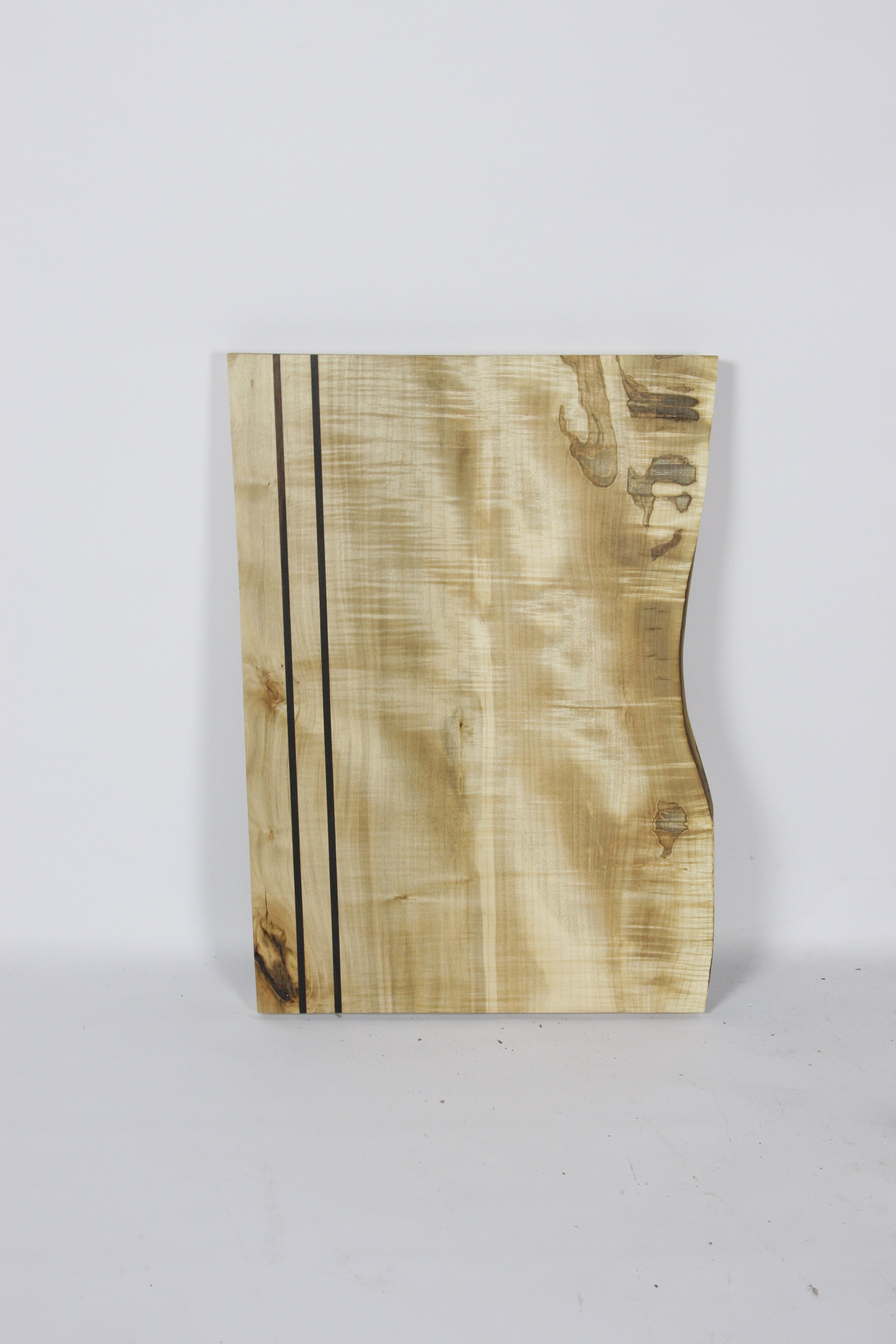 Make an impression with this incredibly figured live edge Curly Maple charcuterie tray. Silky smooth and finished with food safe oil wax, this durable live edge platter will last generations. Embellished with Macassar Ebony inlays.