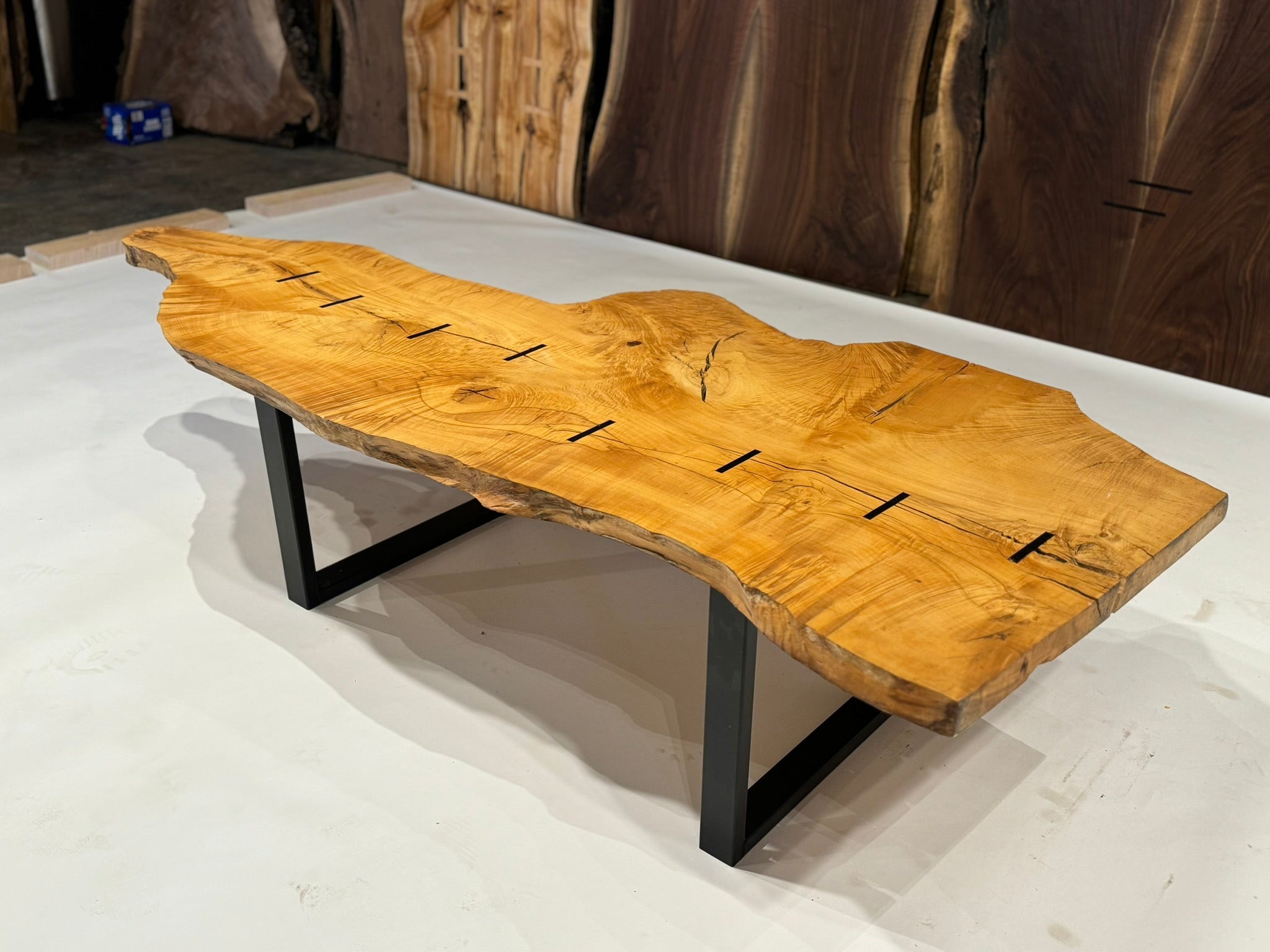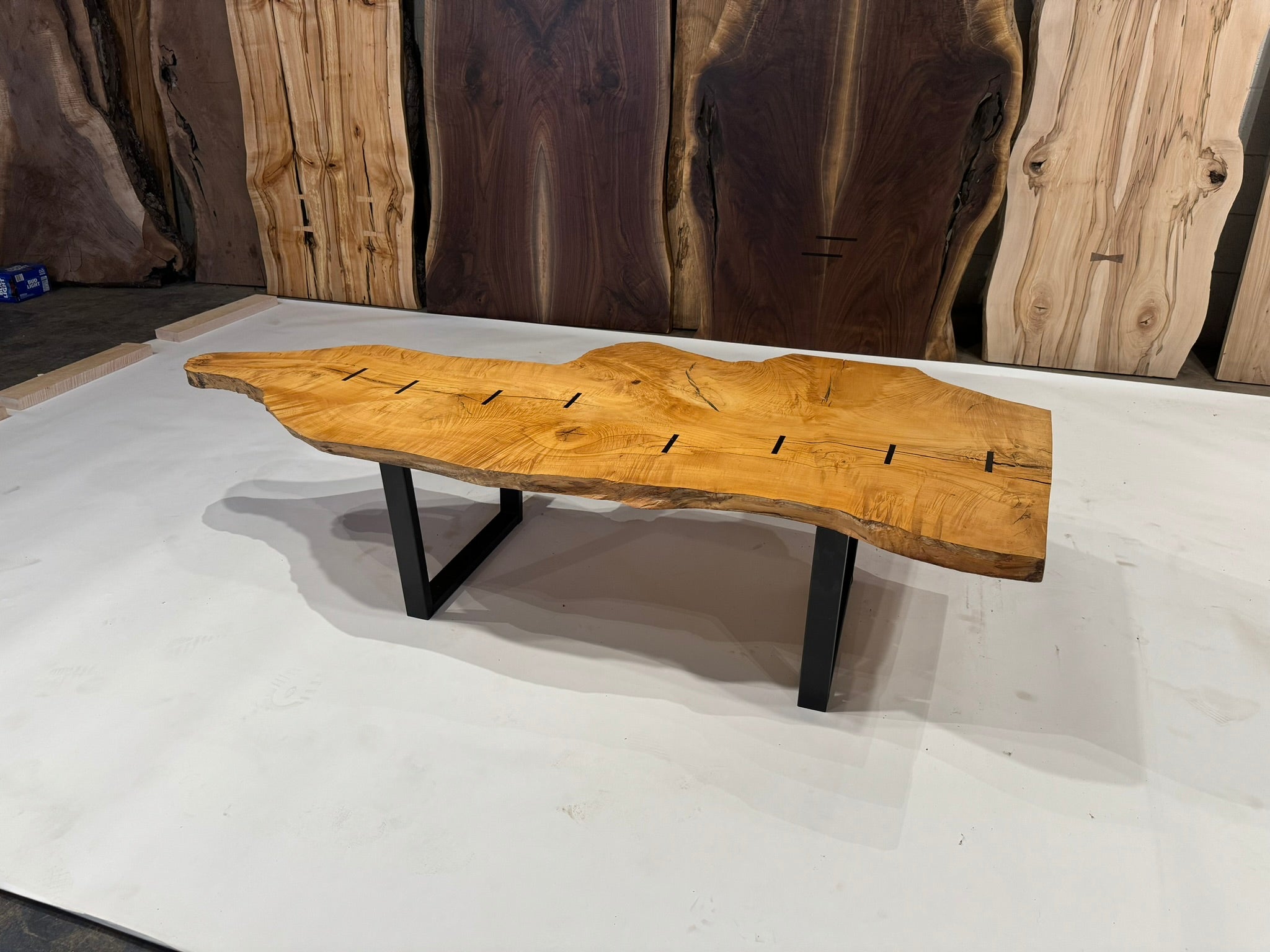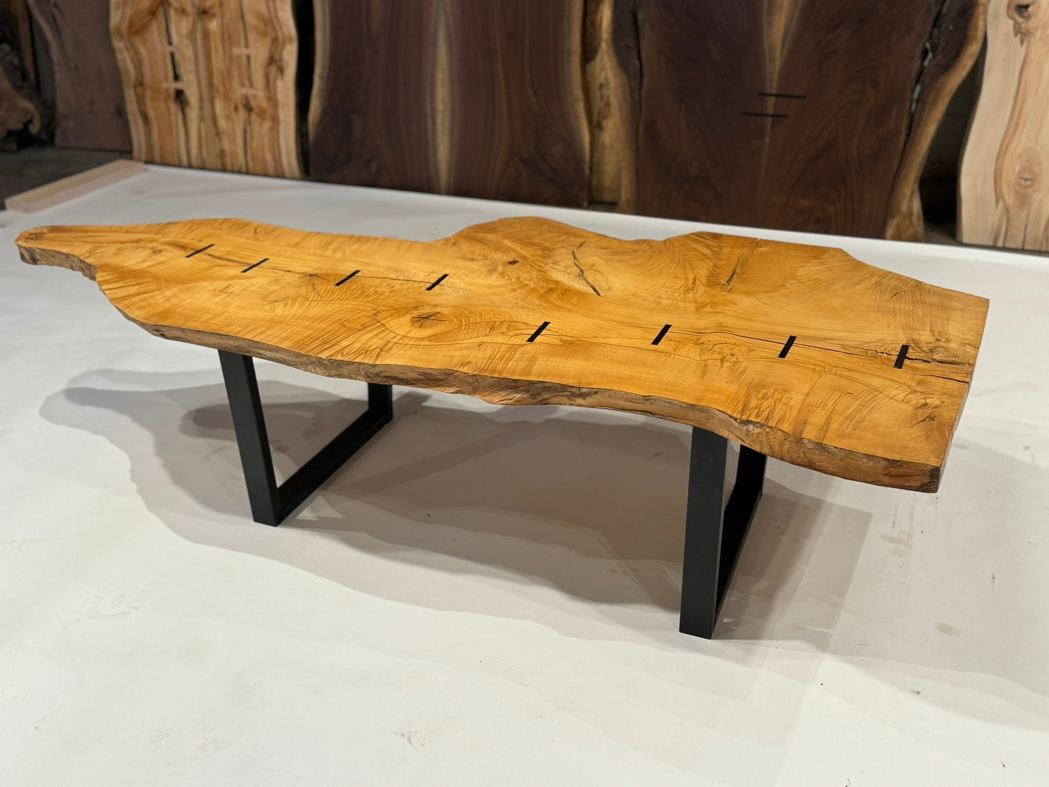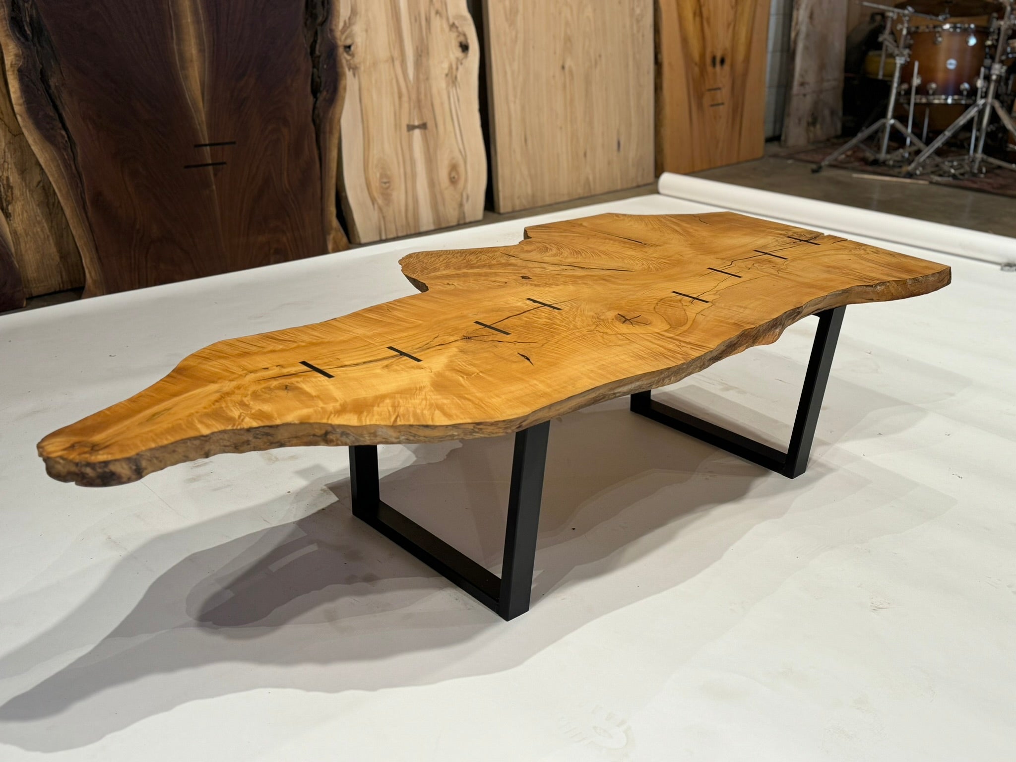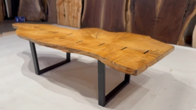 Refined yet grounded, this coffee table showcases a figured Maple top with striking grain, accented by Macassar Ebony inlays and supported by a low-profile steel base. A minimalist, gallery-worthy piece made for design-forward interiors.