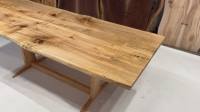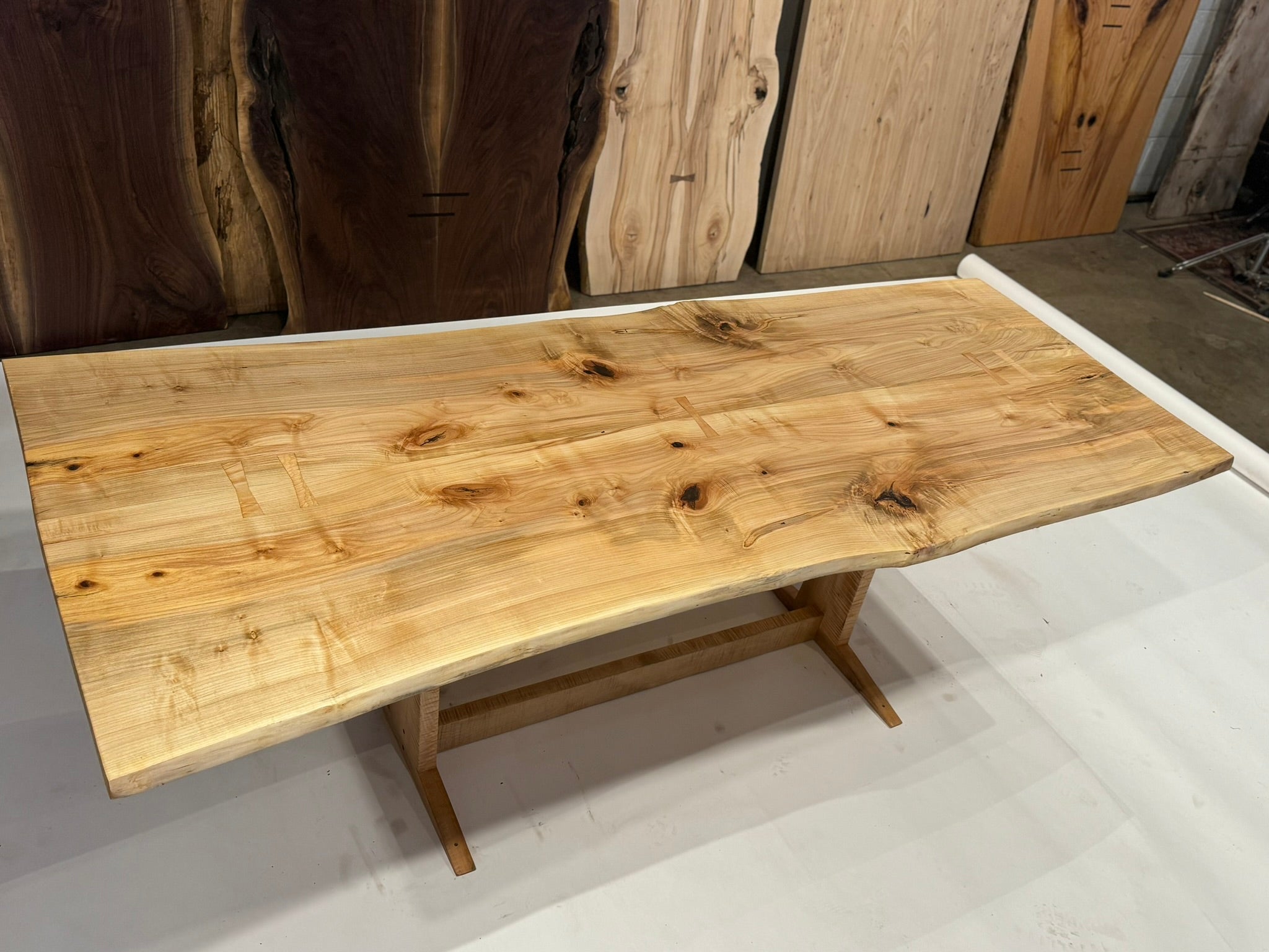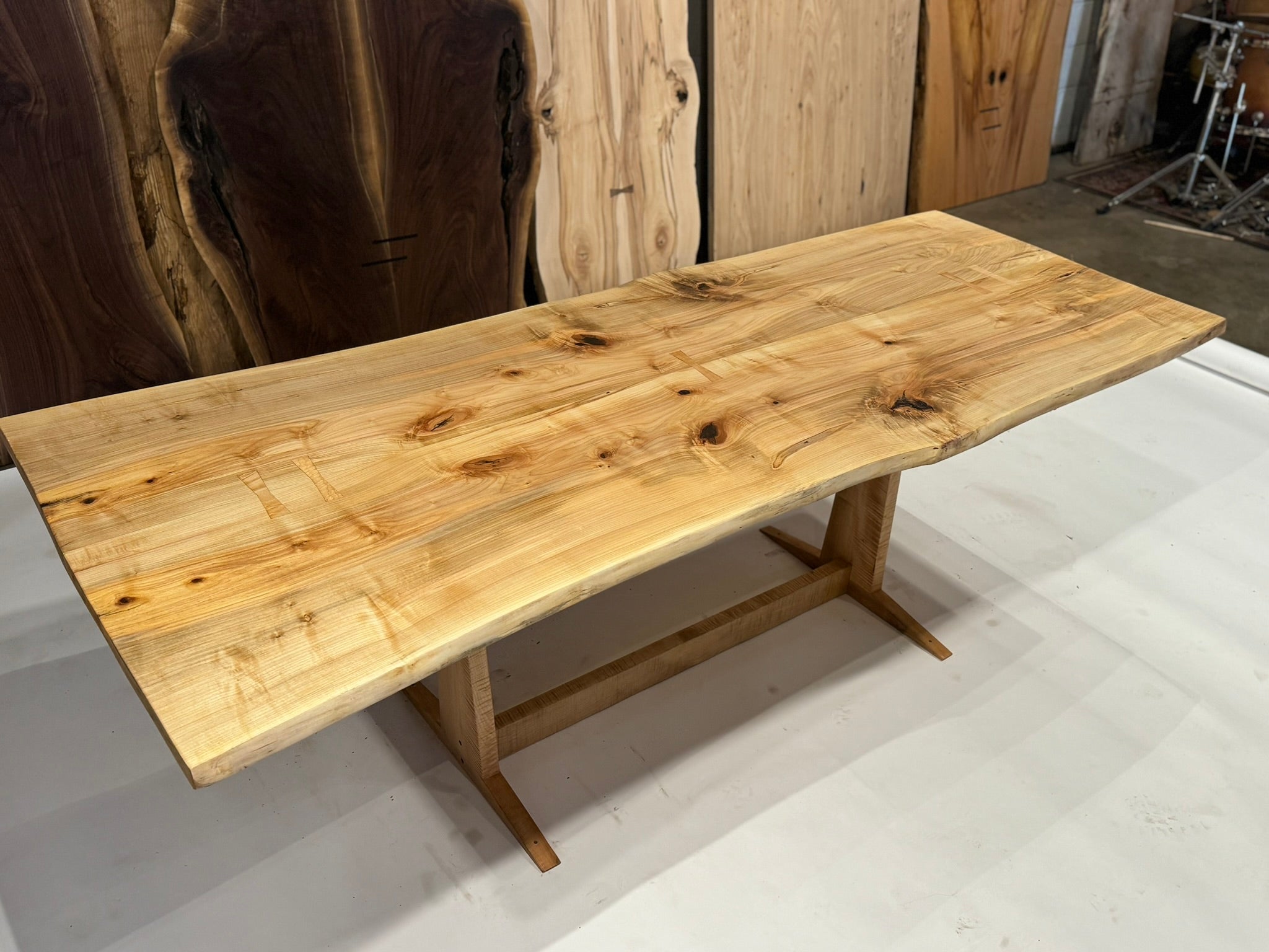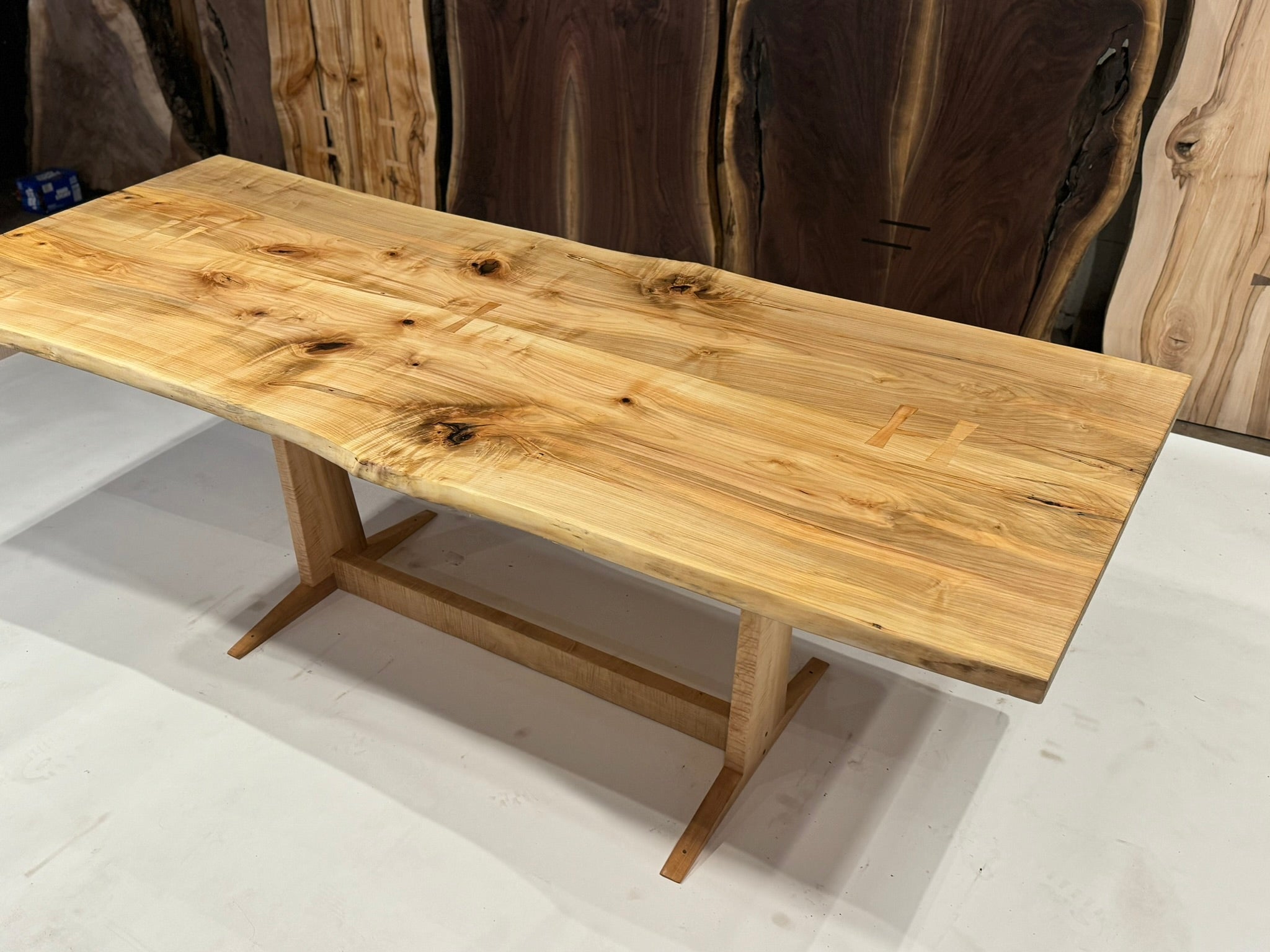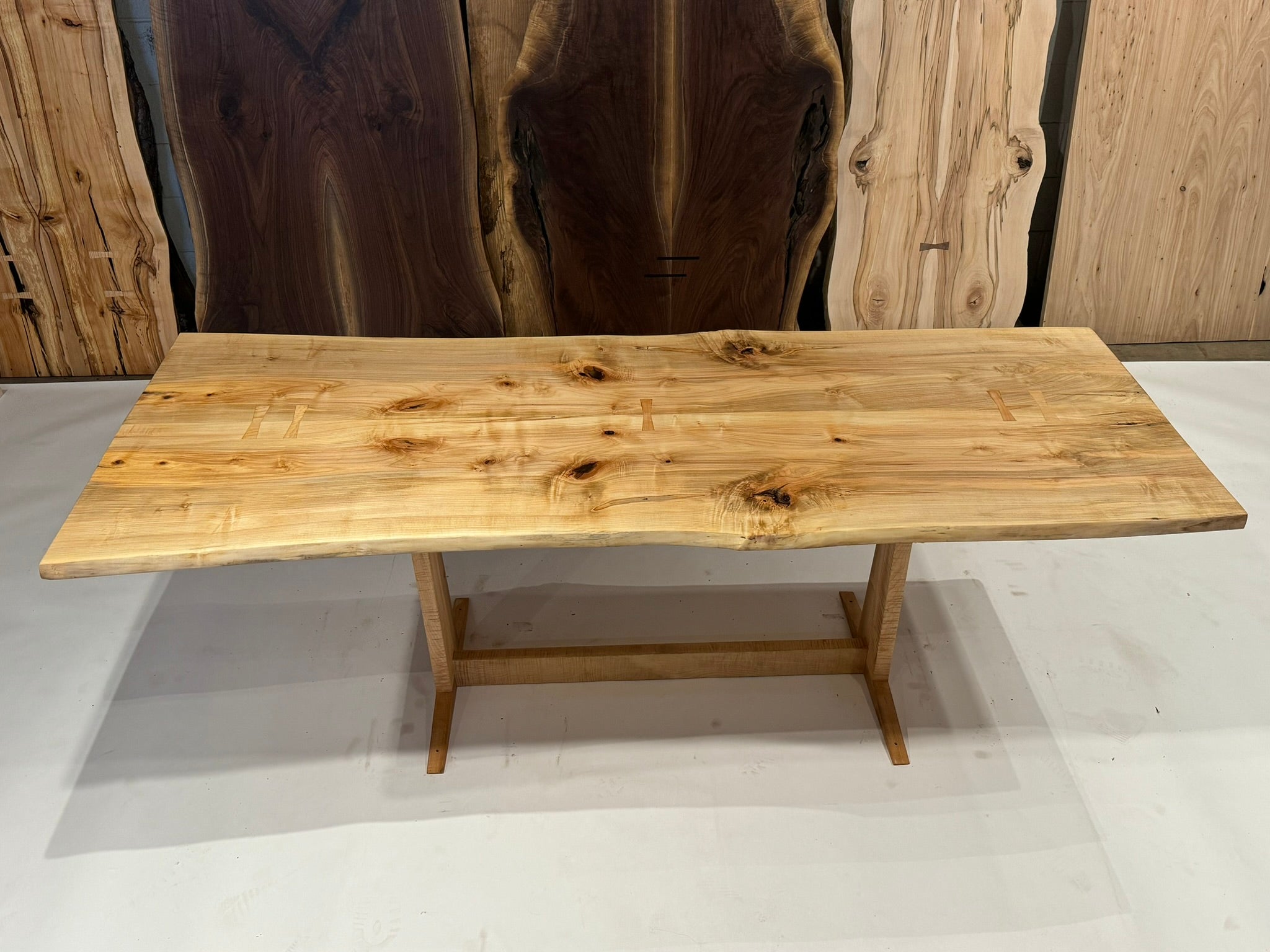 Bright, clean, and full of motion, this figured Maple dining table glows with internal light. The Curly Maple bowties and base create a unified composition of subtle textures — a refined centerpiece for modern dining rooms.