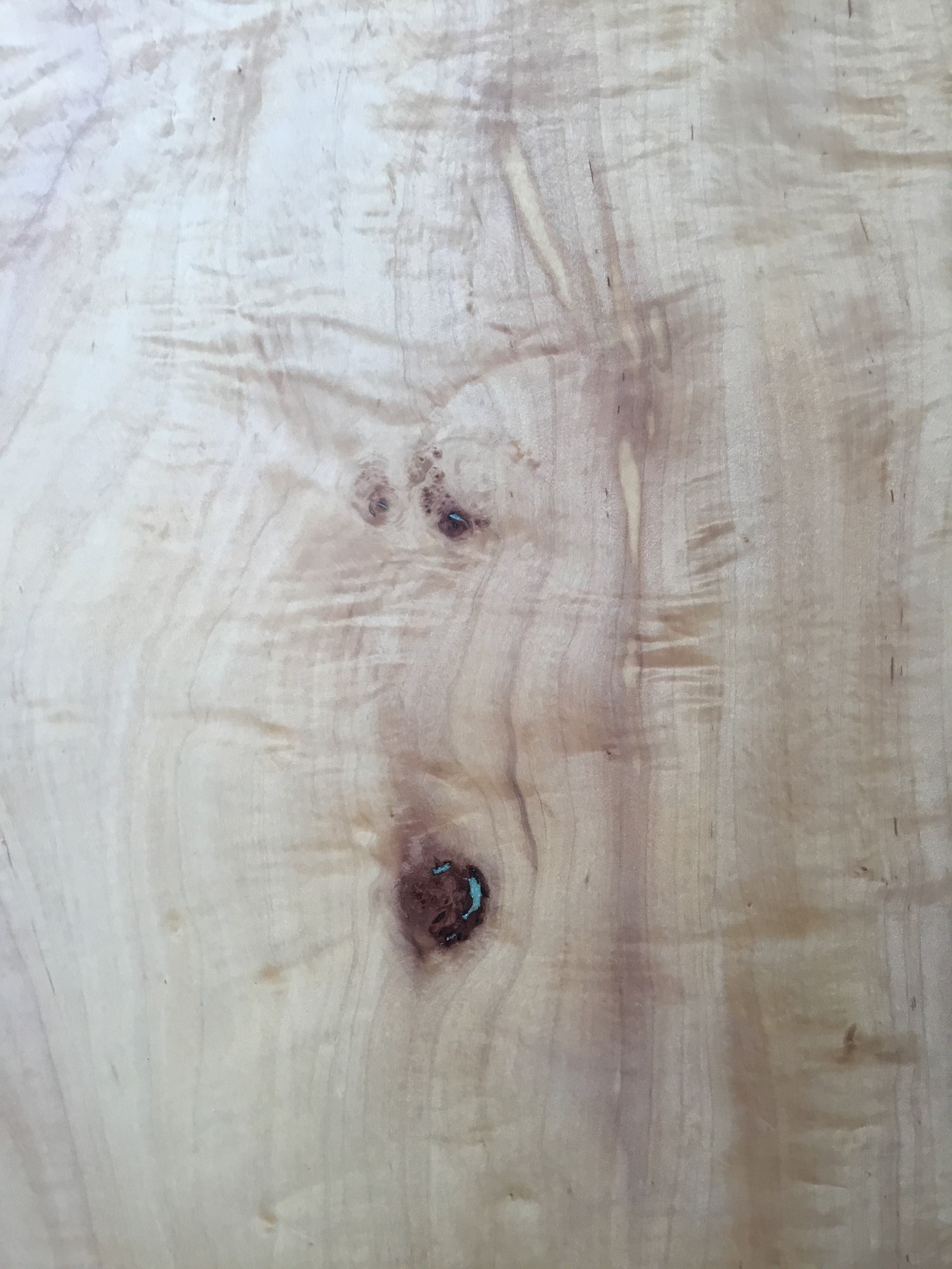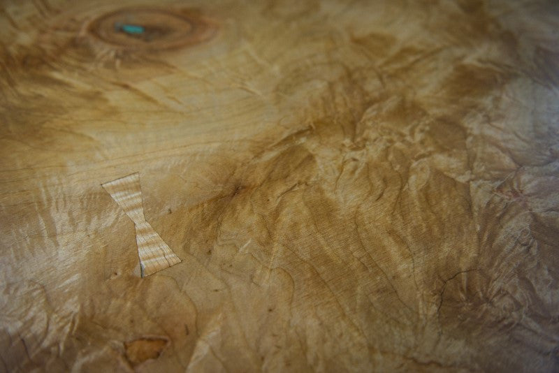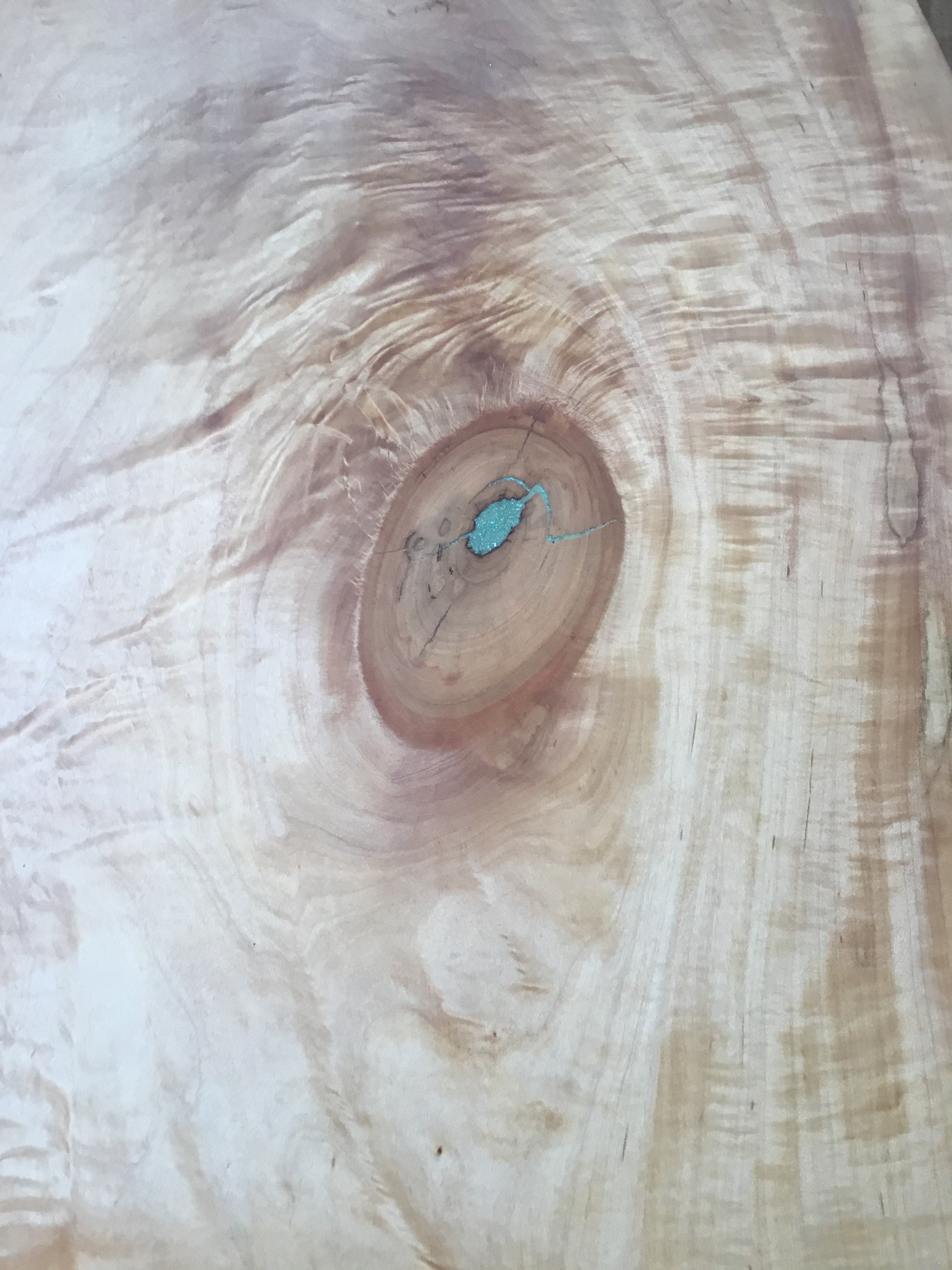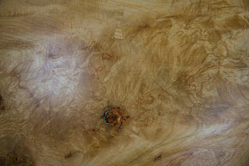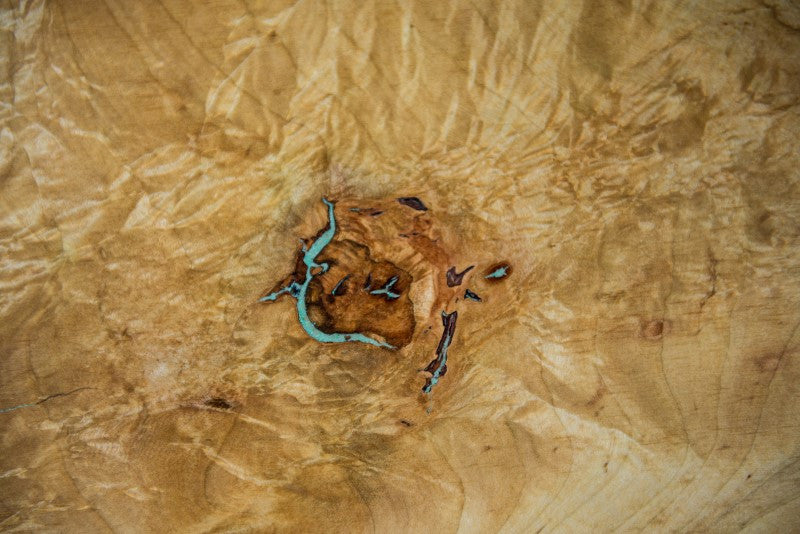 Crushed turquoise highlights this majestic beauty. Incredibly figured with outstanding quilting and movement from every angle. It is hand rubbed with a 100% organic oil and wax treatment using our own Live Edge Artisan Wood Oil Wax. This incredible heritage piece is smooth and silky to the touch. Included is a hand crafted solid wood Curly Maple table base.