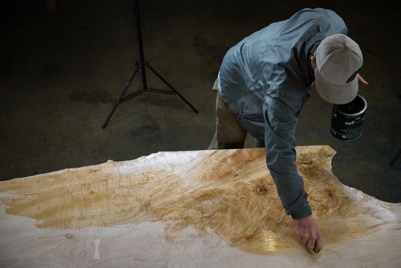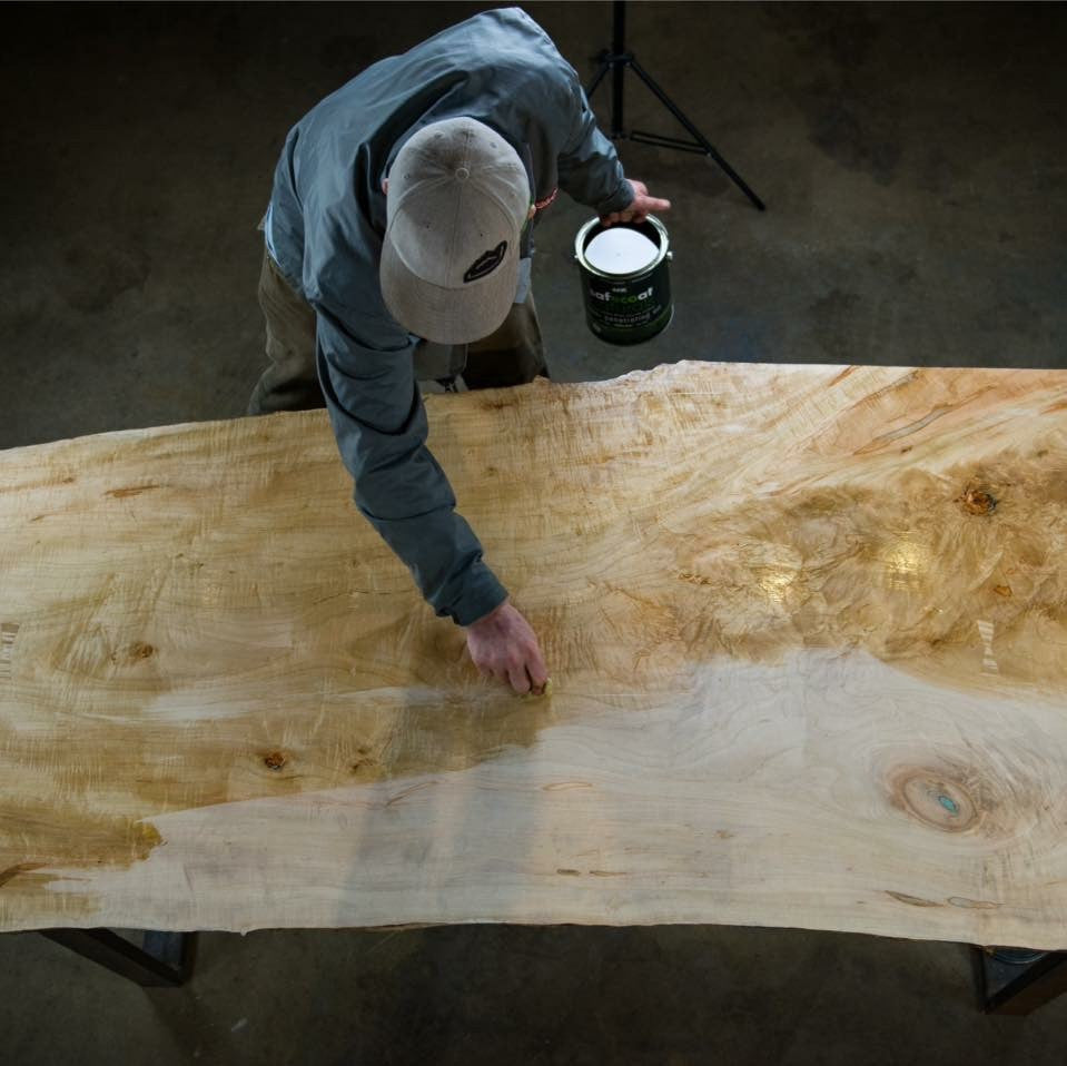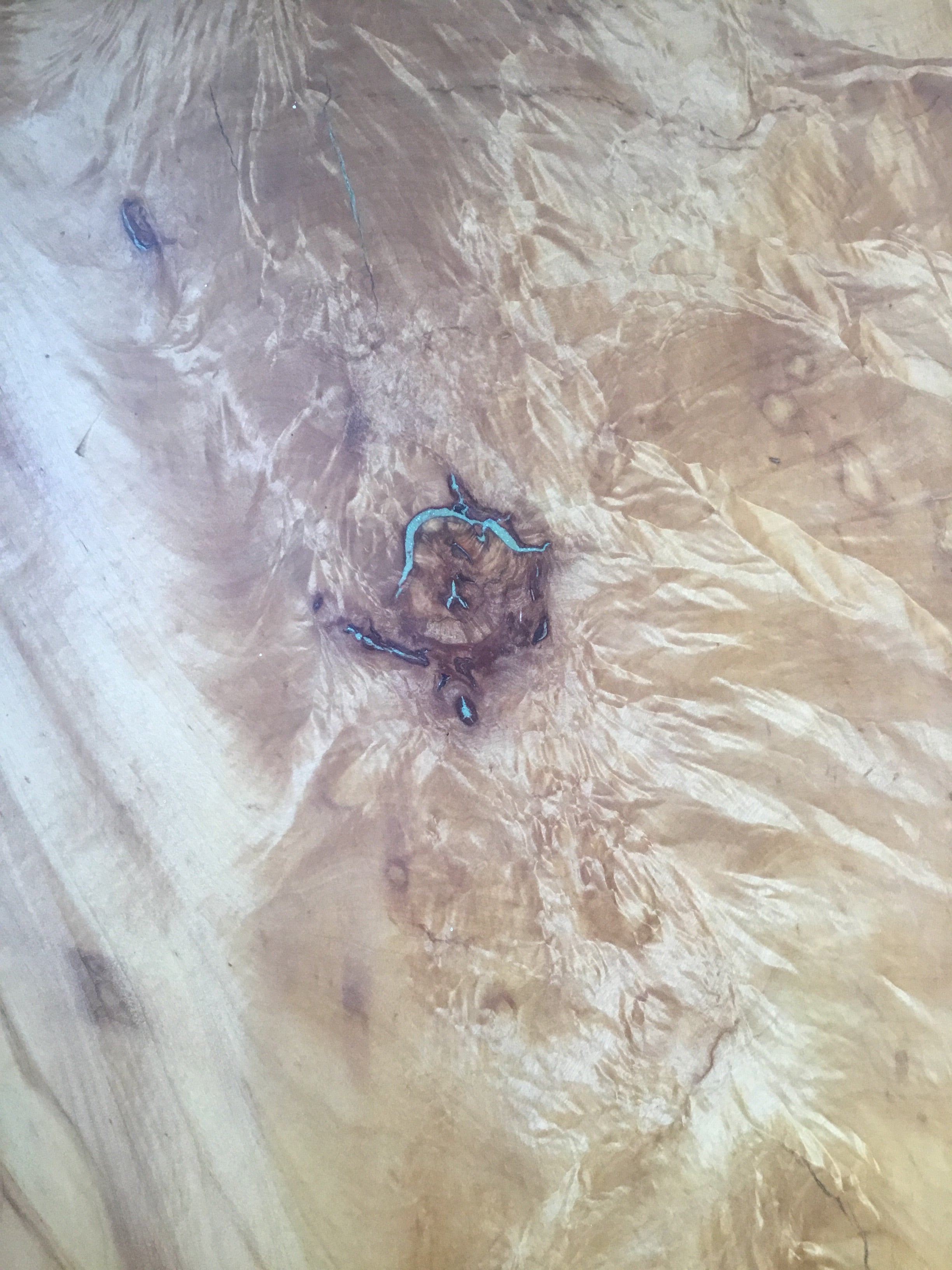 Crushed turquoise highlights this majestic beauty. Incredibly figured with outstanding quilting and movement from every angle. It is hand rubbed with a 100% organic oil and wax treatment using our own Live Edge Artisan Wood Oil Wax. This incredible heritage piece is smooth and silky to the touch. Included is a hand crafted solid wood Curly Maple table base.