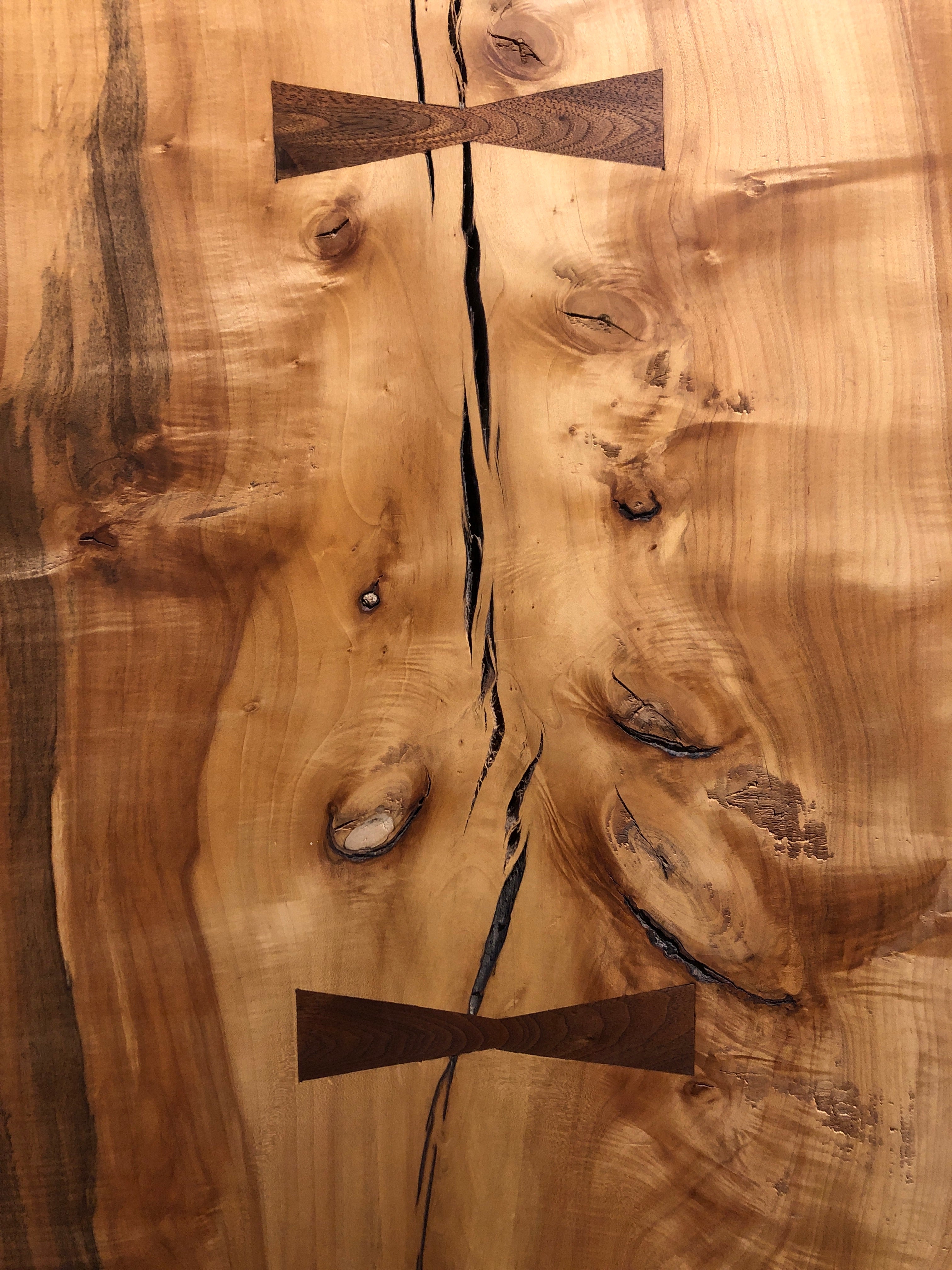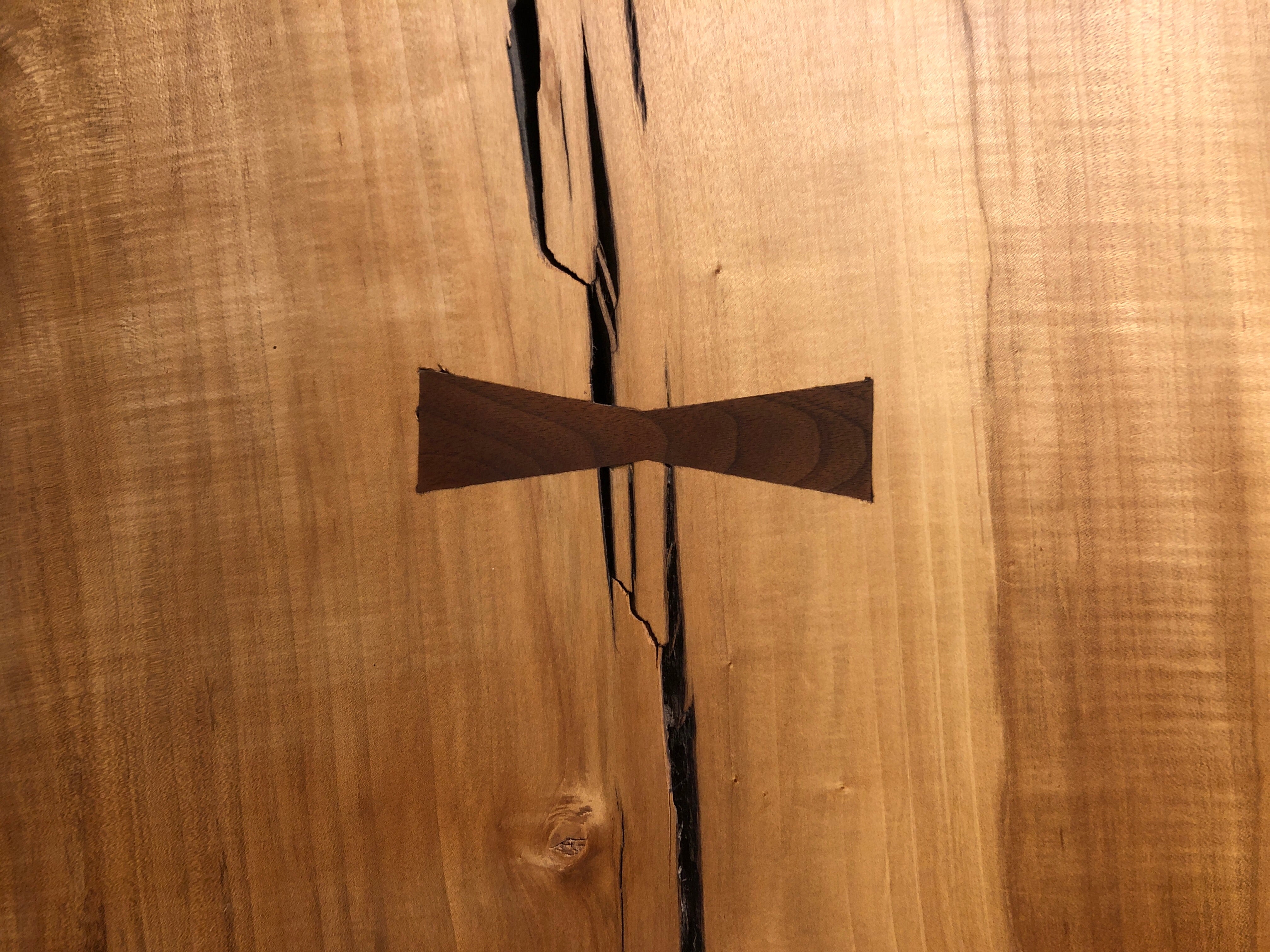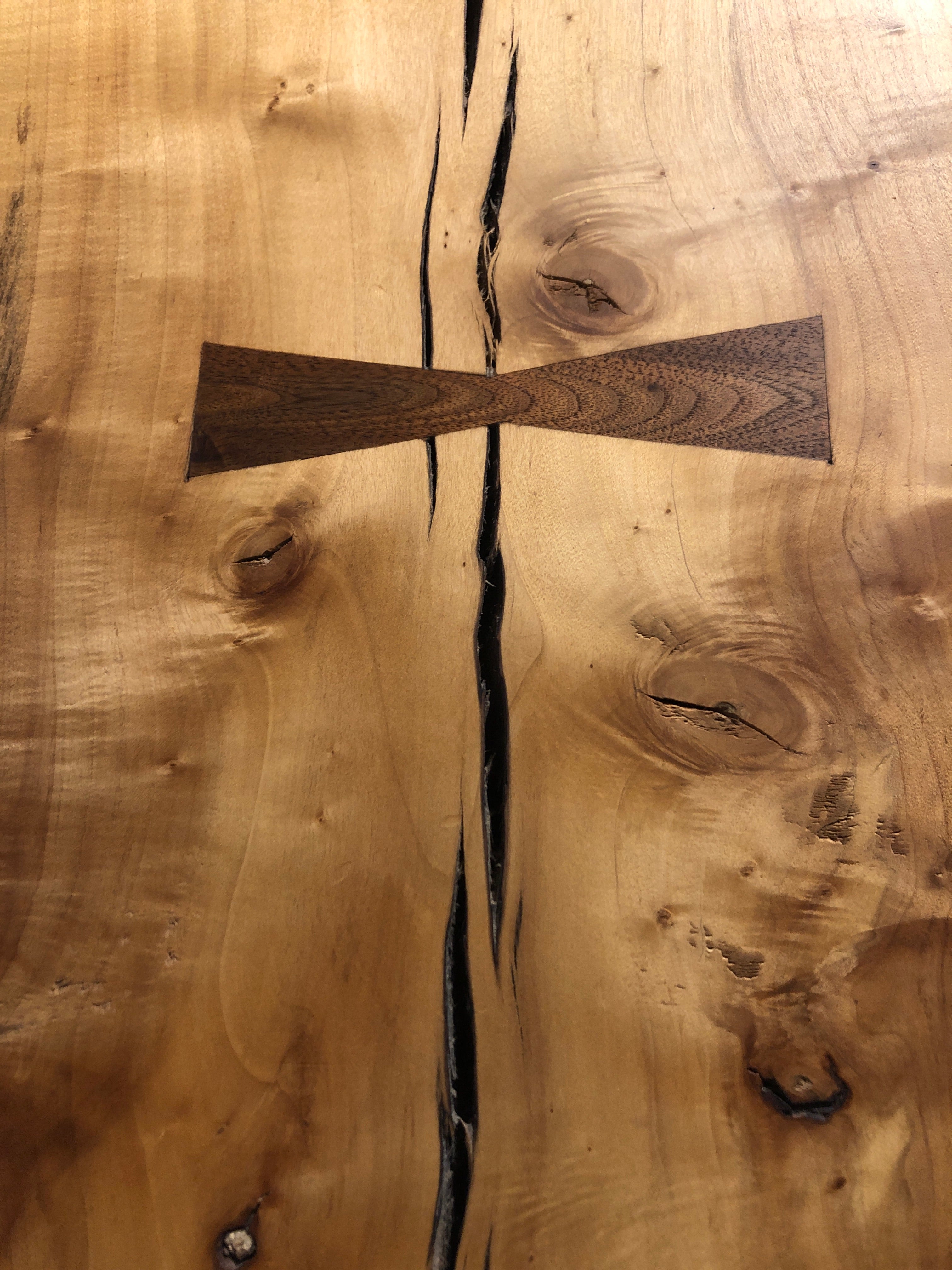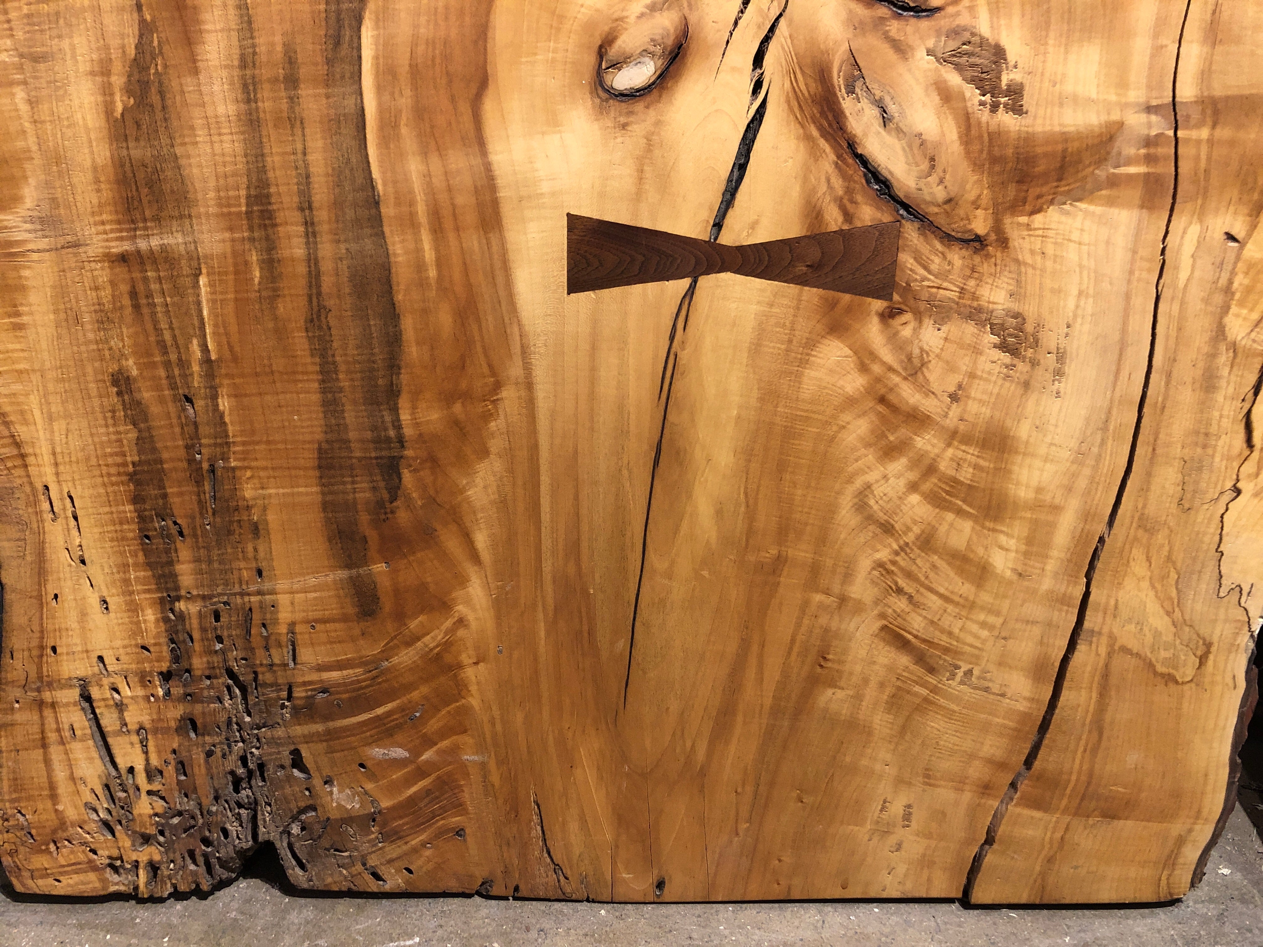 This Spalted Maple table is a breathtaking piece. Embellished with Black Walnut inlays, this piece is sure to make a statement. Heavy, thick, and finished in satin lacquer, this piece is as durable as it is beautiful. Perfect for an island top, dining table, desk and more. This piece is sold as a top only with options to purchase with a choice of fabricated steel or solid wood table base.