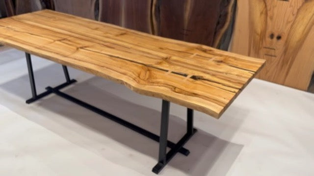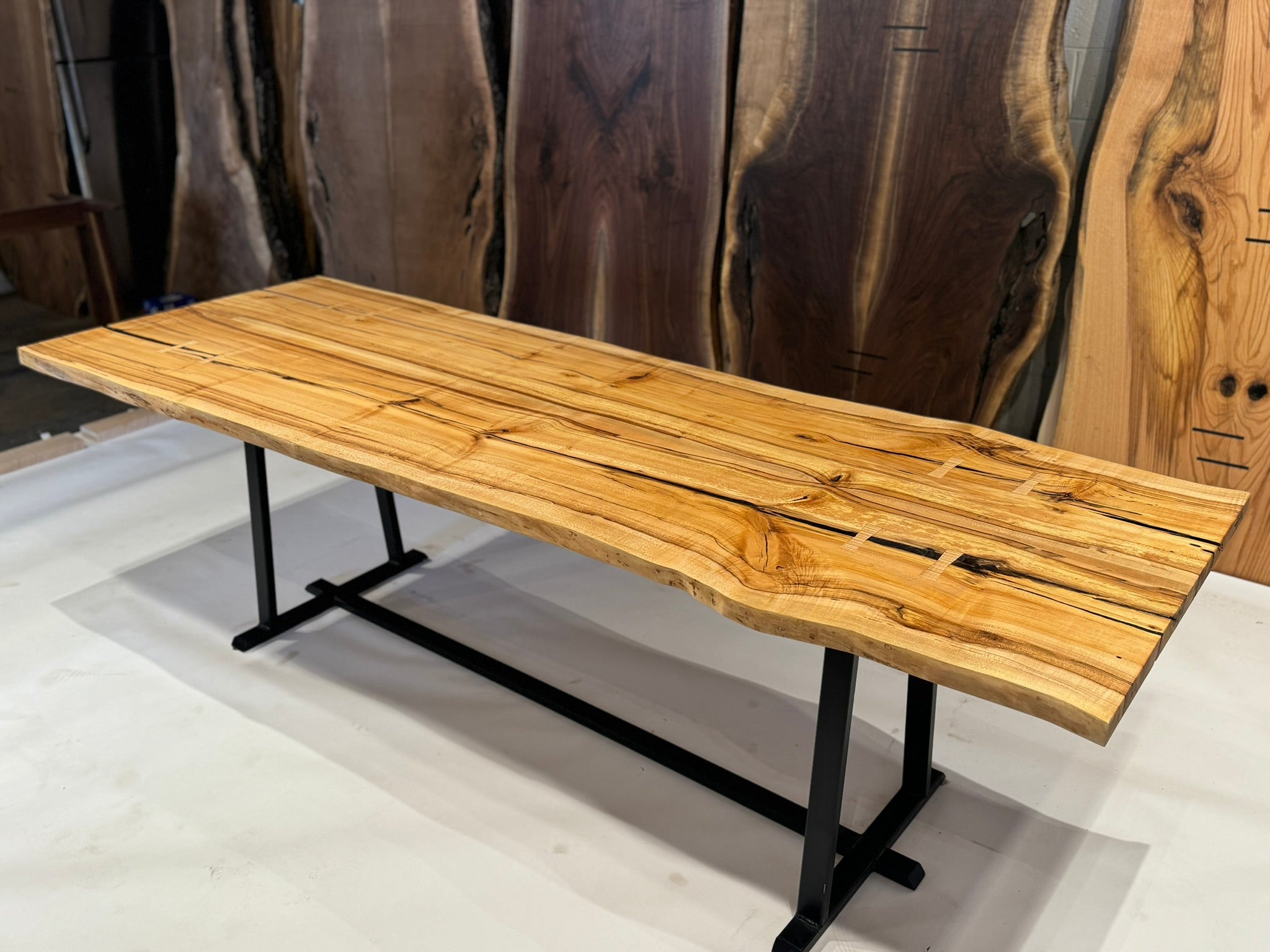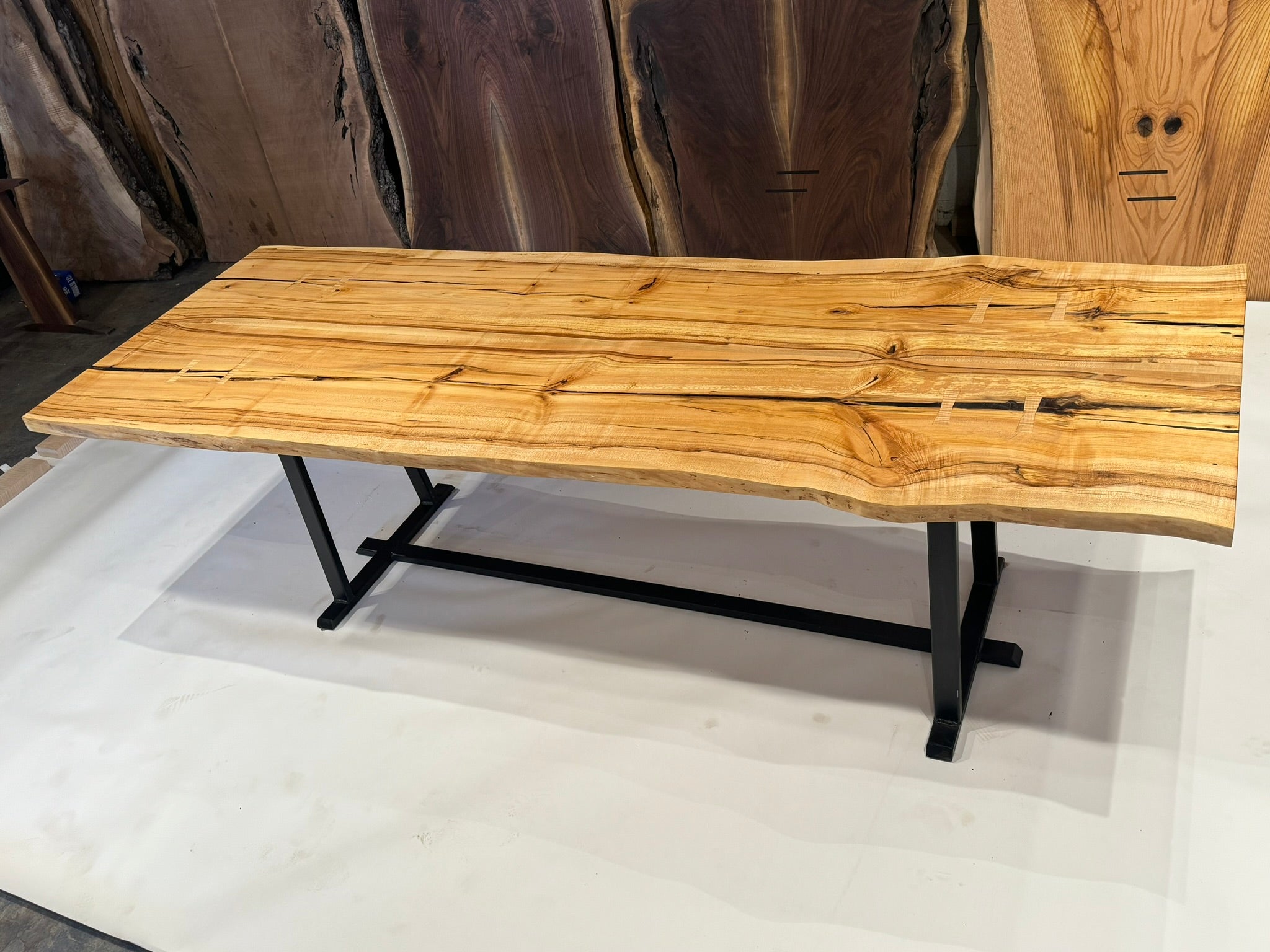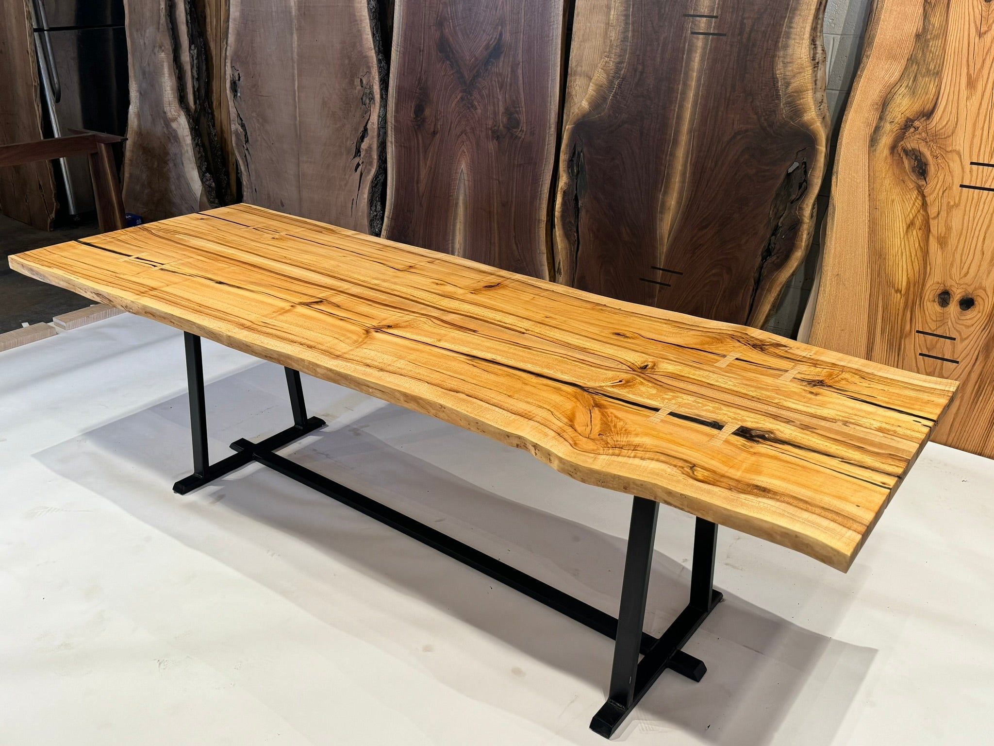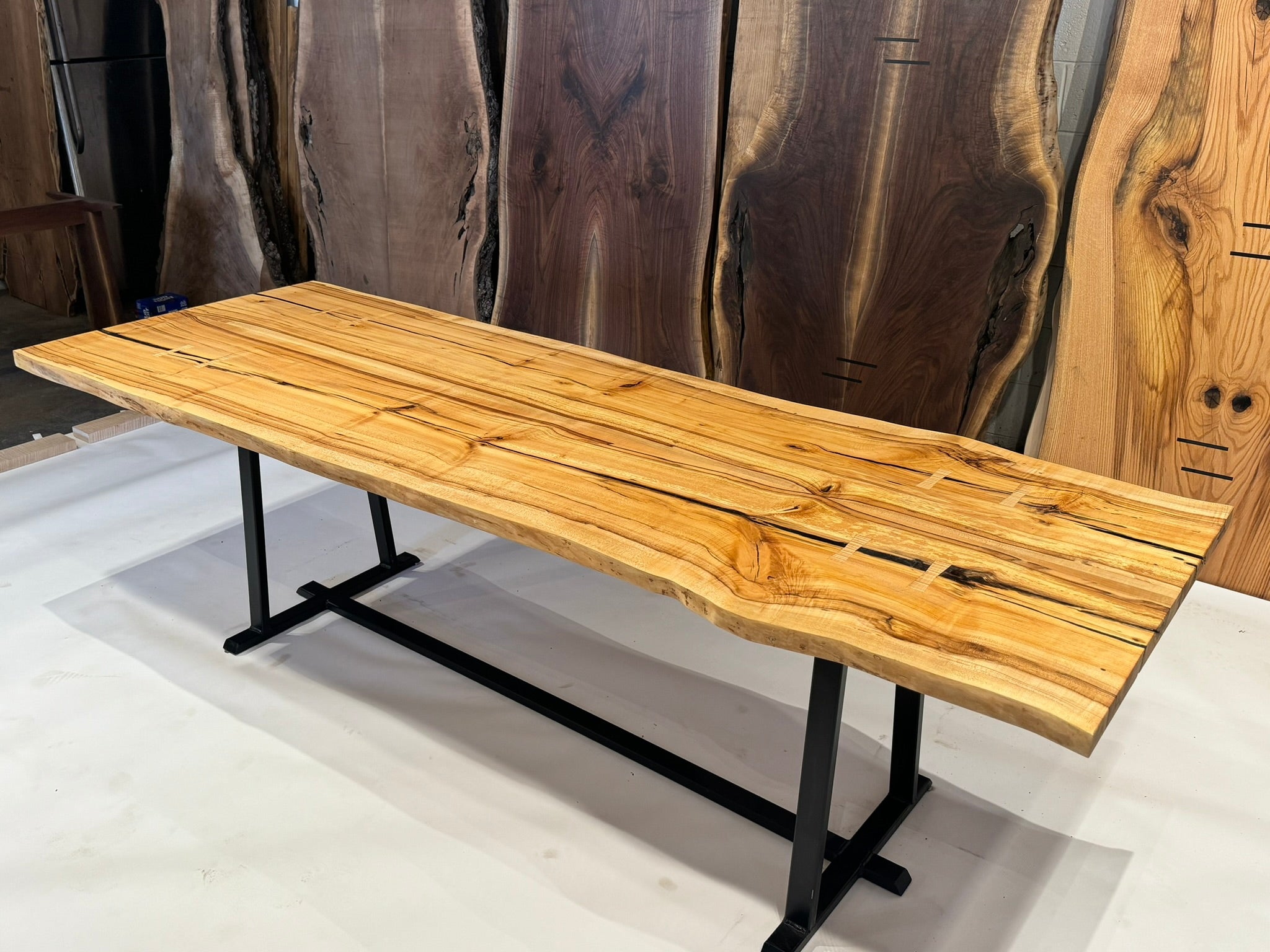 Raw elegance meets modern edge in this 96” x 32” live edge Maple dining table, expertly crafted to preserve the organic beauty of the wood while introducing sleek, industrial structure. The golden-hued Maple top flows naturally with its untouched edges, showcasing every ripple, knot, and contour just as the tree grew it.