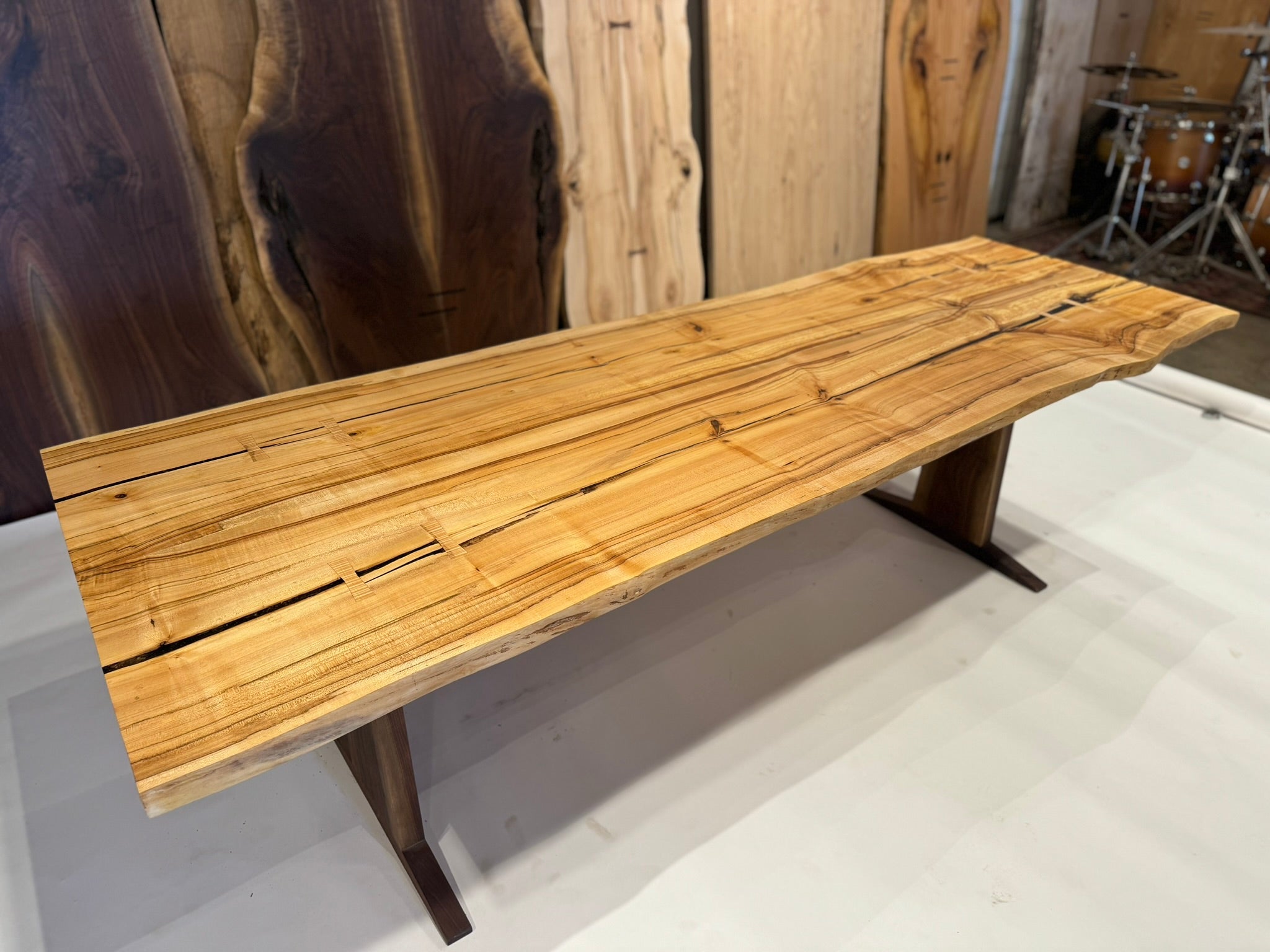 • Materials: Live edge Maple top, Curly Maple inlays, Black Walnut base