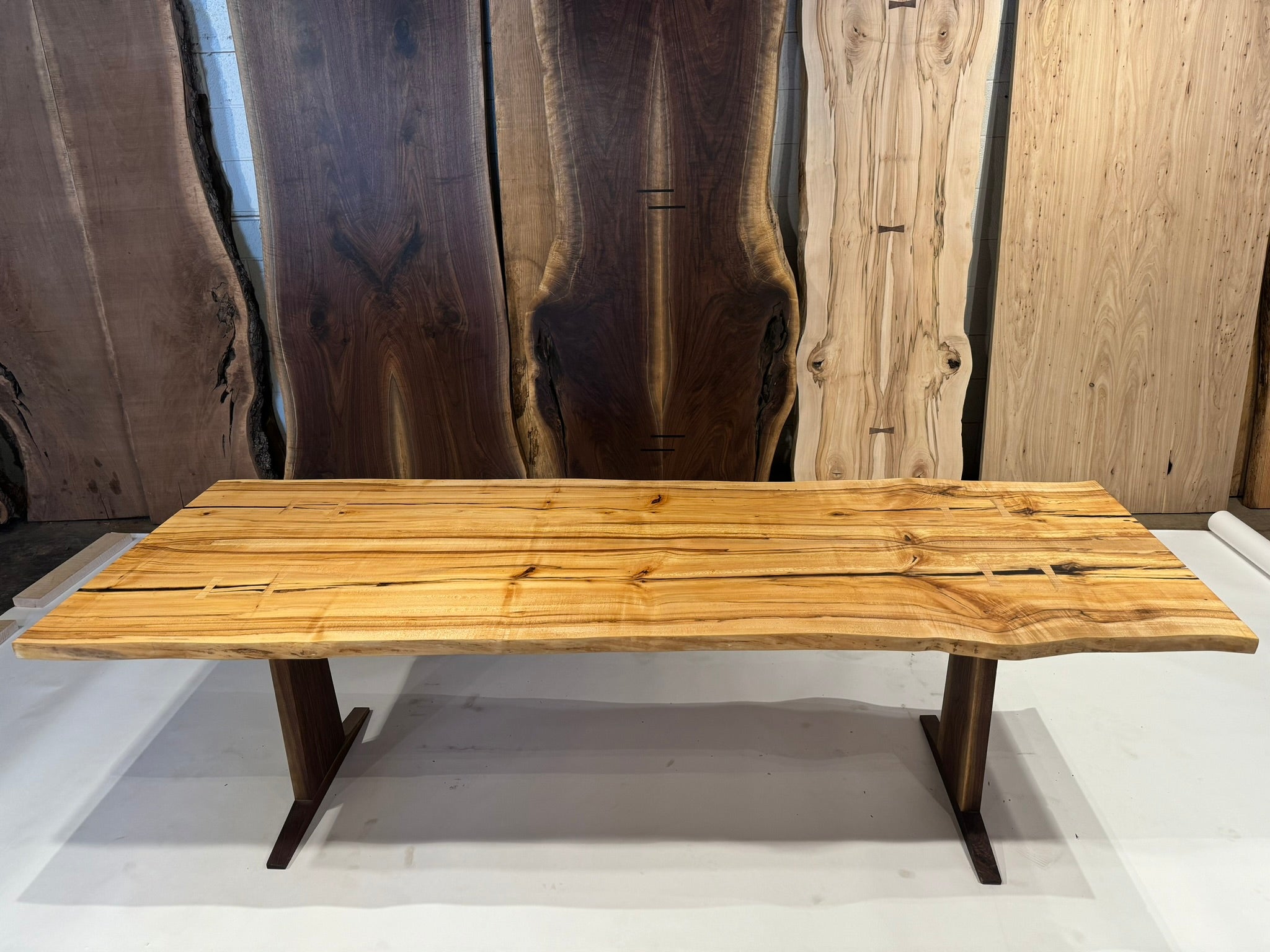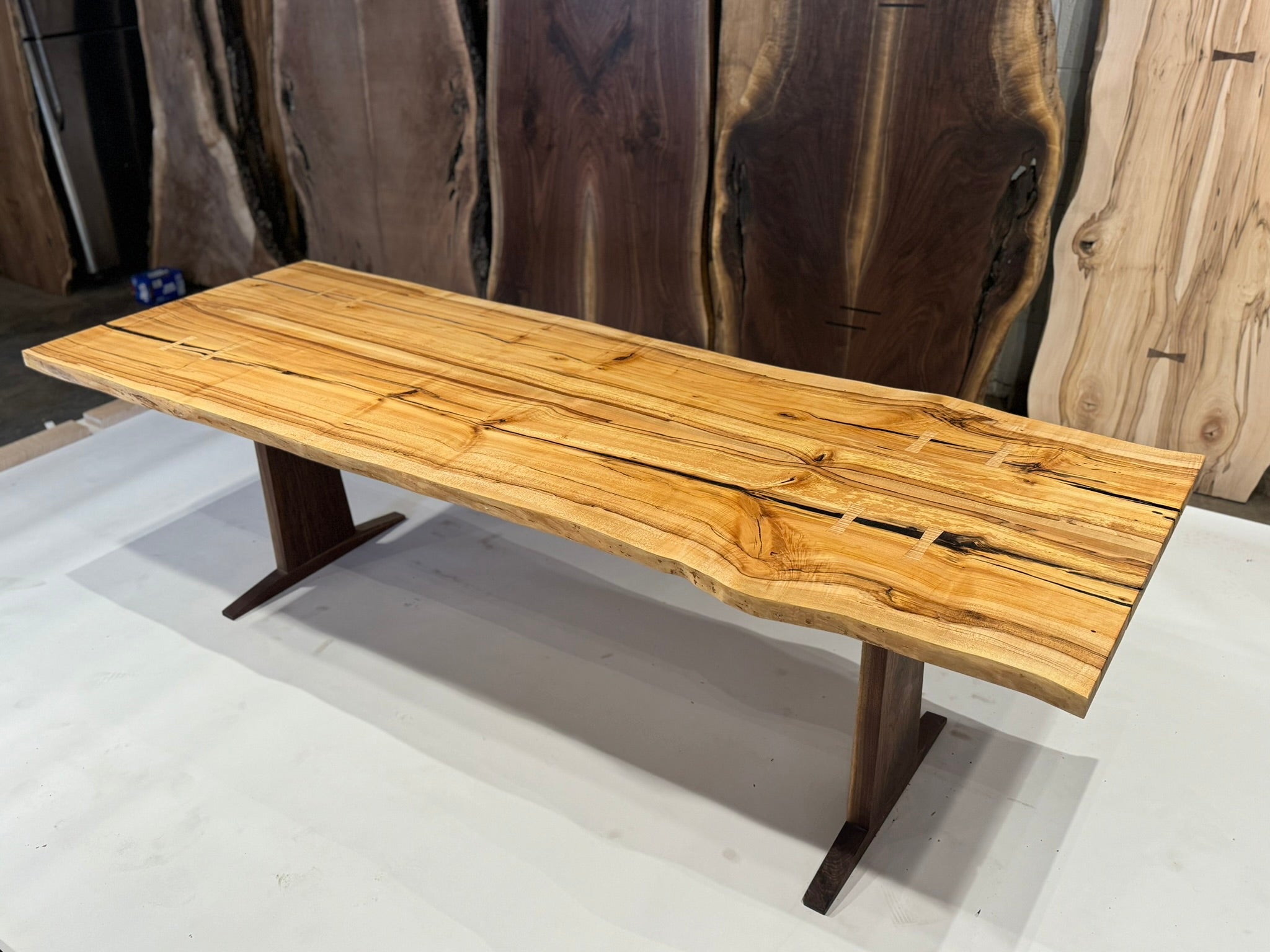 This 96” x 32” live edge dining table is a refined celebration of contrast, texture, and master craftsmanship. The top, crafted from solid Maple, flows naturally with the organic lines of its live edge, highlighting soft, golden grain and understated elegance.