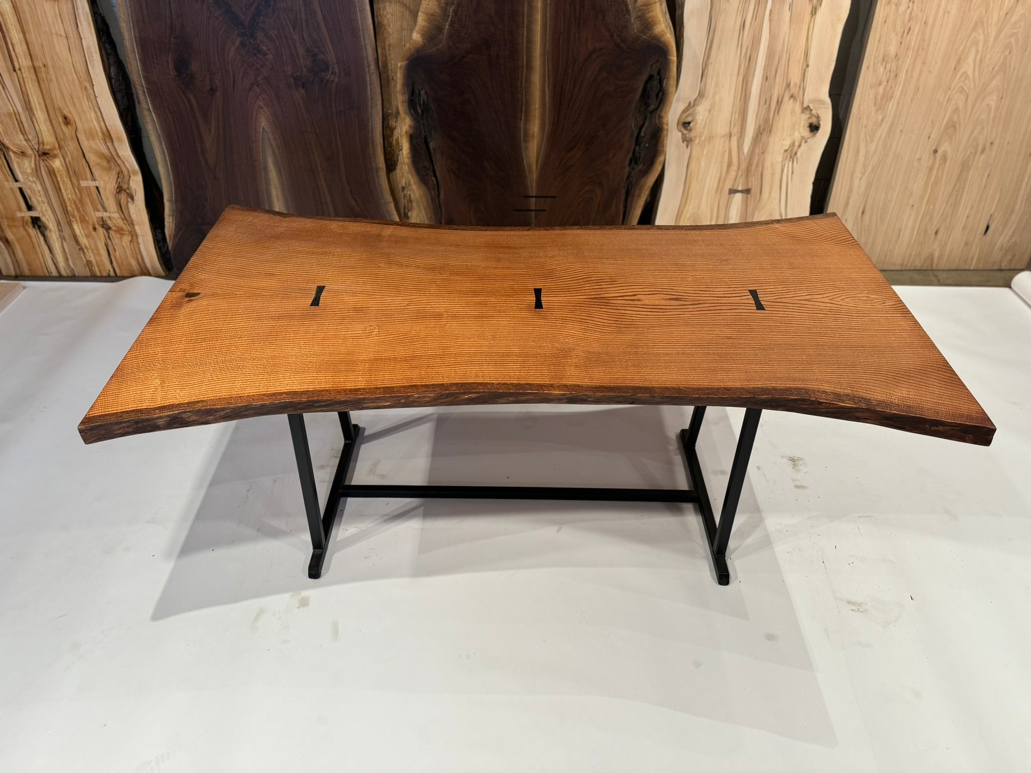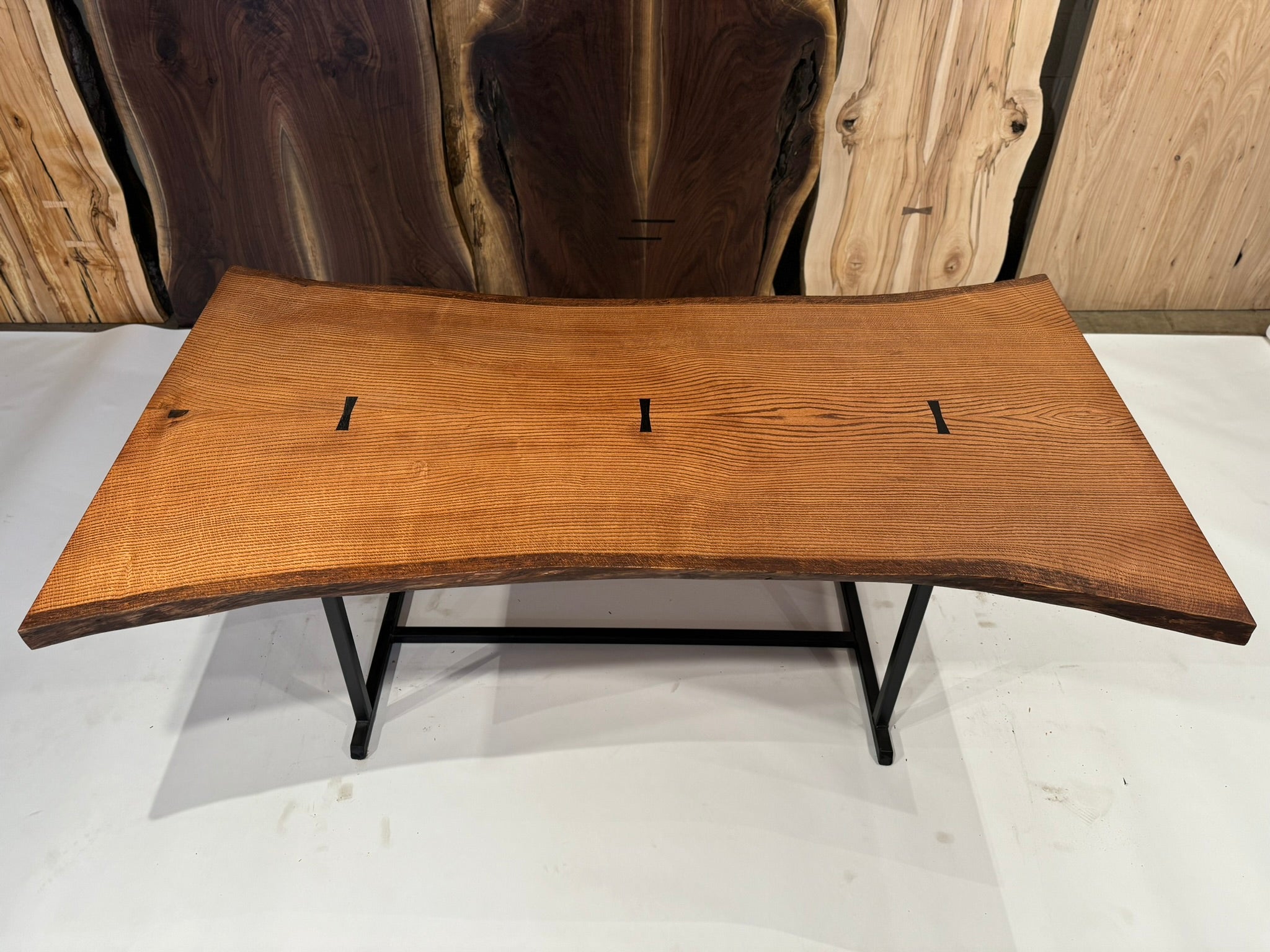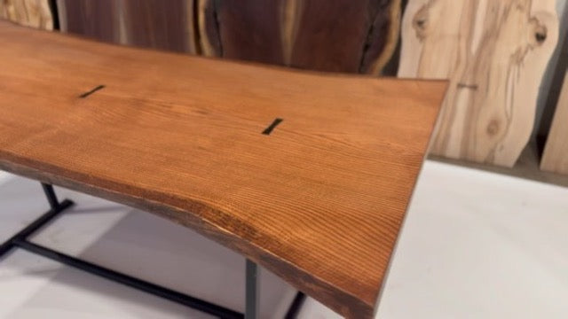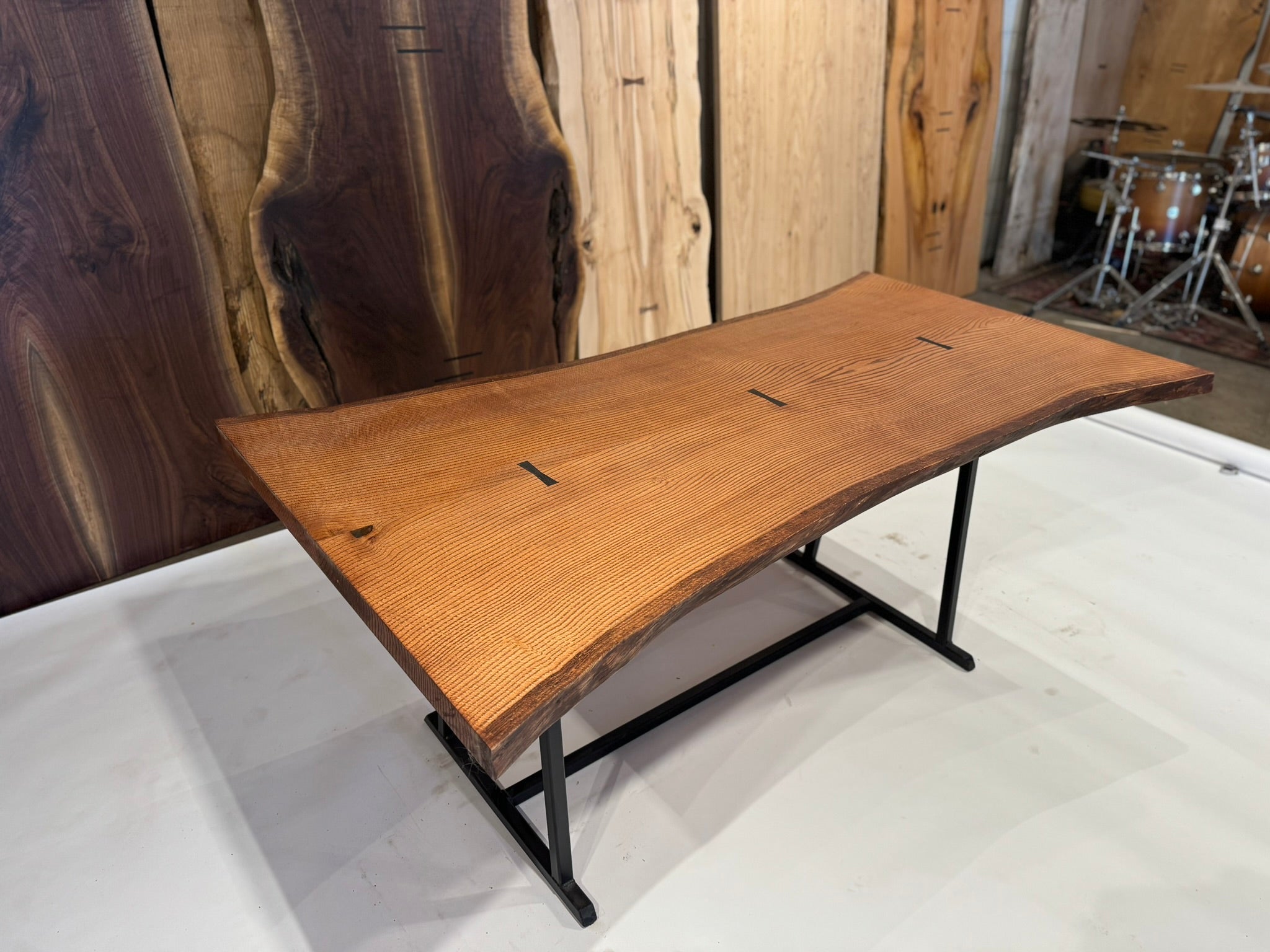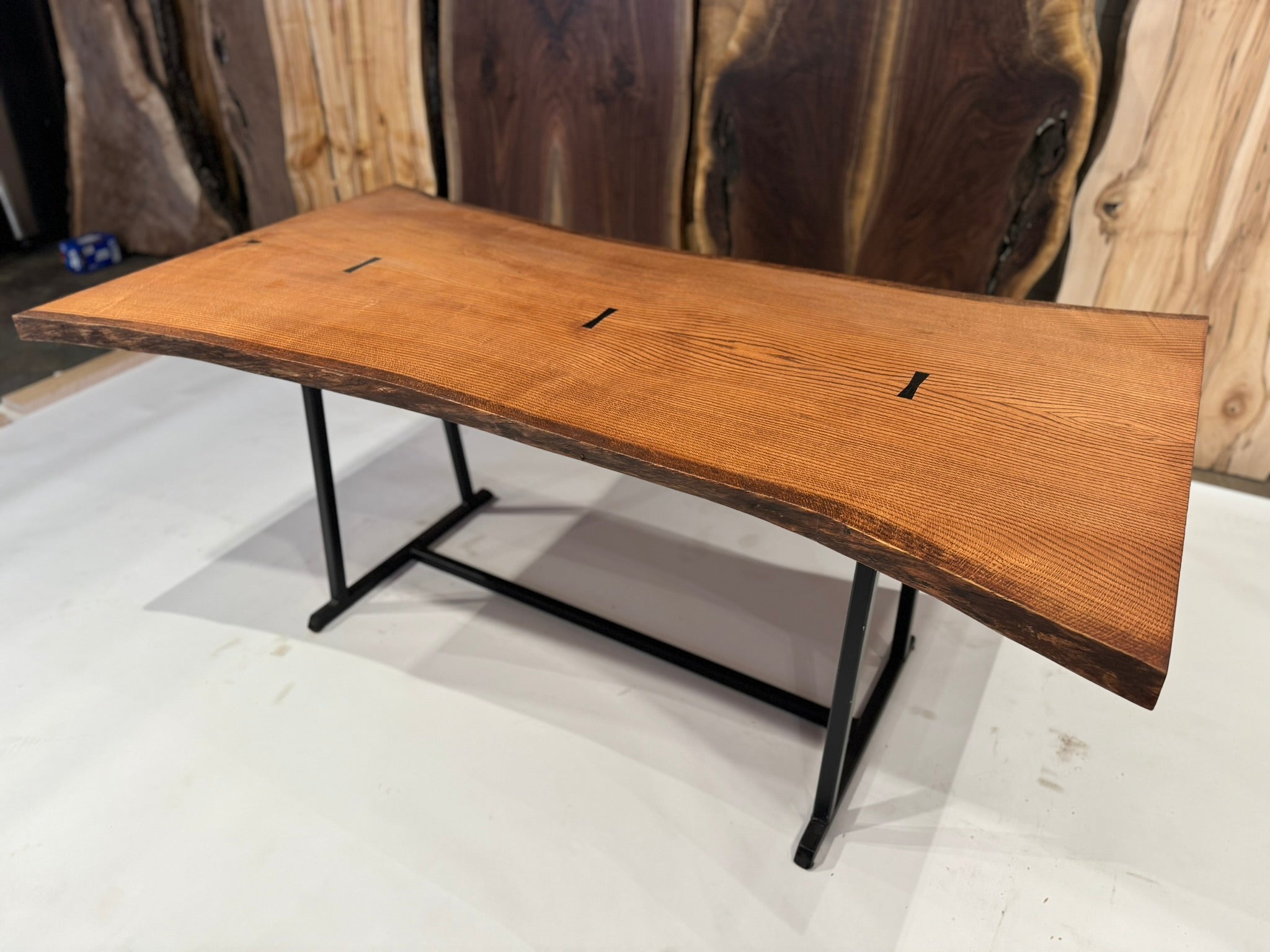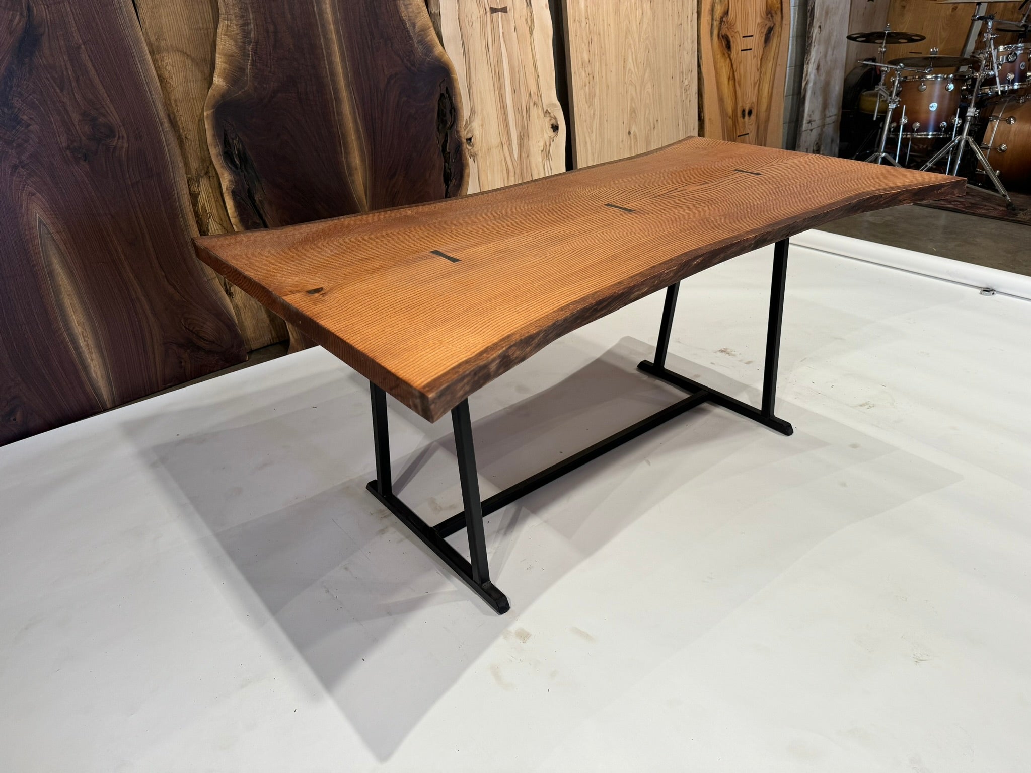 This dining table pairs the bold, straight grain of Red Oak with the striking contrast of McCaster Ebony inlays, all grounded by a black steel base. The live edge adds a rustic touch, while the base offers an industrial foundation for a modern-rustic fusion.