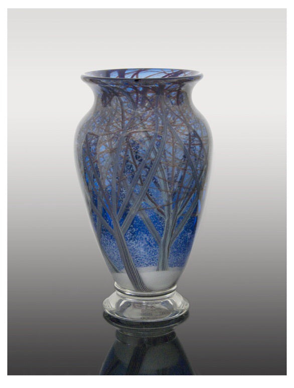 Set on a pale blue ground, several layers of hand drawn trees and gently falling snow are separated by clear encasements, to create this stunning and peaceful design. Once completed and encased once more, it is mouth blown and formed by hand.